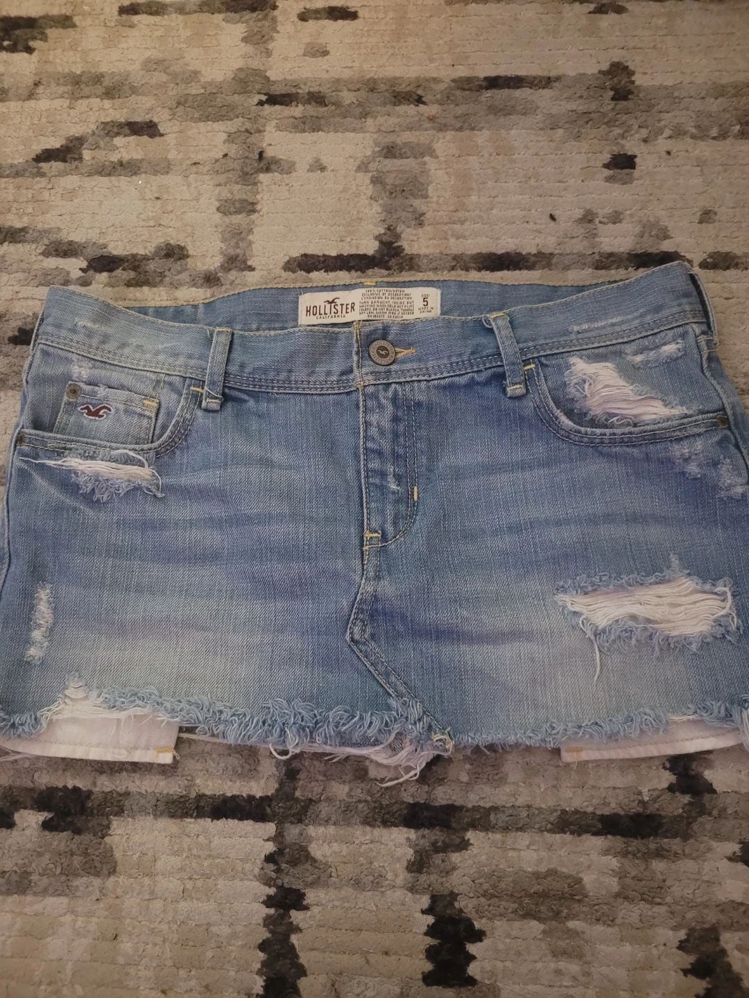 10Cute Hollister denim skirt in a light wash. They have a good amount of distressing and a frayed hem, perfect for a casual summer look! Size 5.