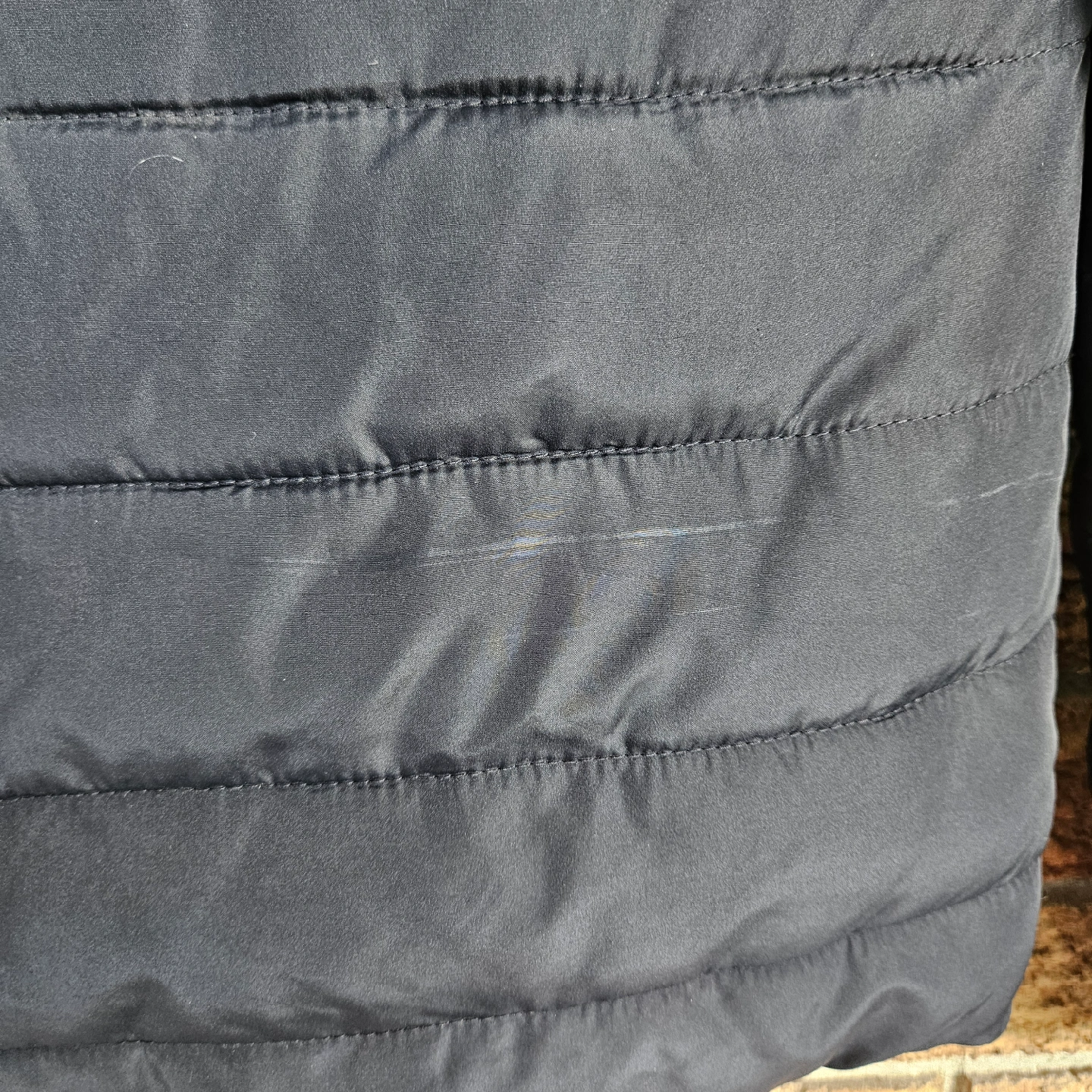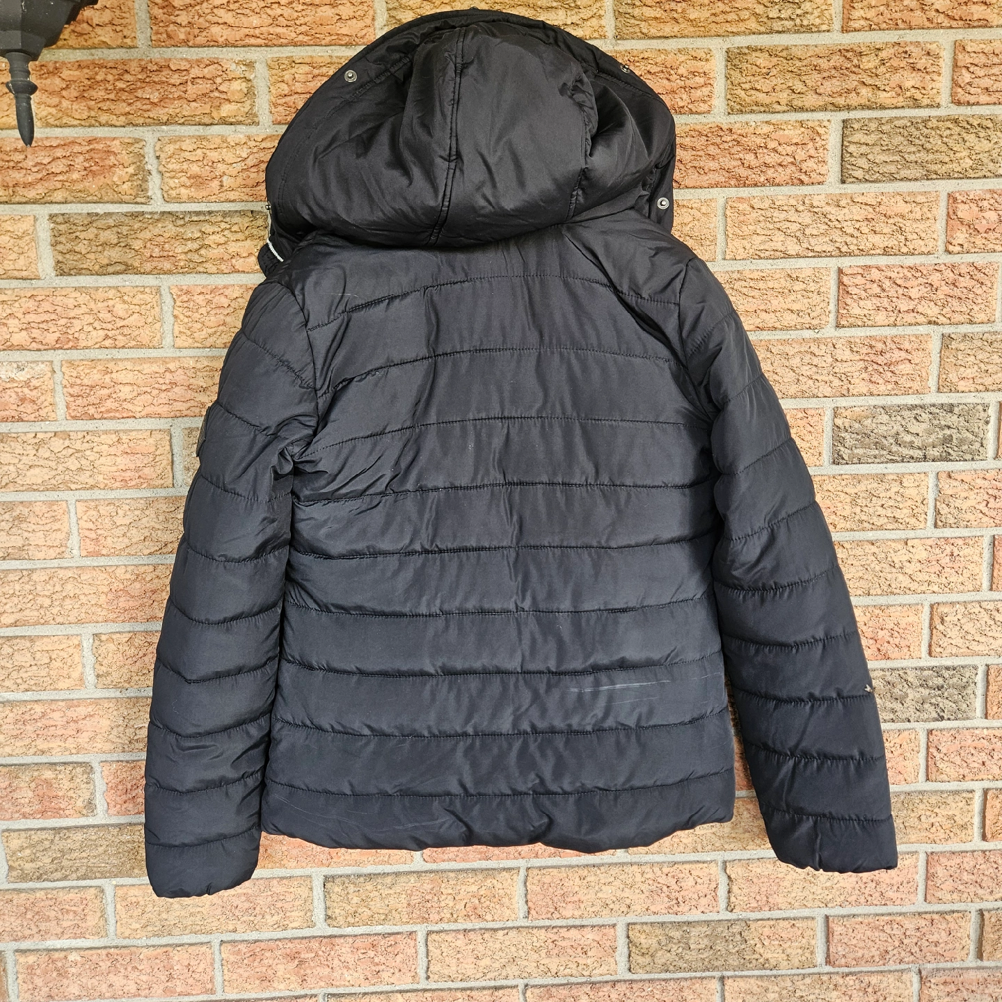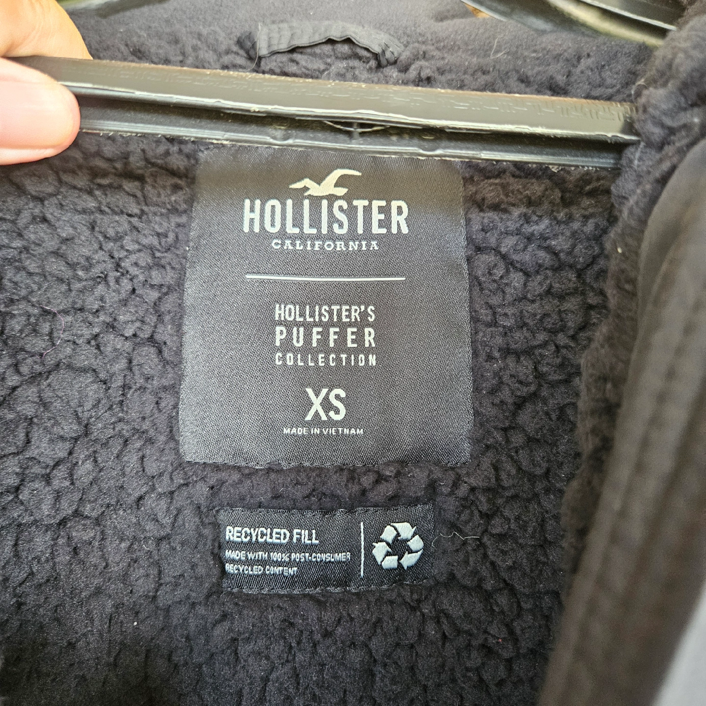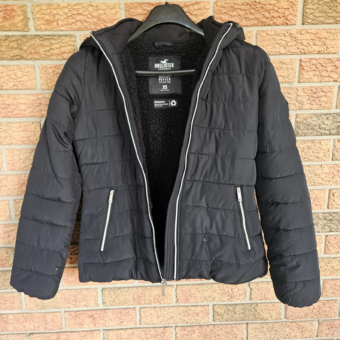 HOLLISTER FAUX FUR LINED PUFFER JACKET COAT BLACK WOMENS SIZE XS Length 24" Chest 19" Sleeve 25" Two front zippered pockets Some marks, on back and back shoulder, not sure what has caused, stain like, but could not remove when cleaning. Please see photos (last two) as they are part of the description.