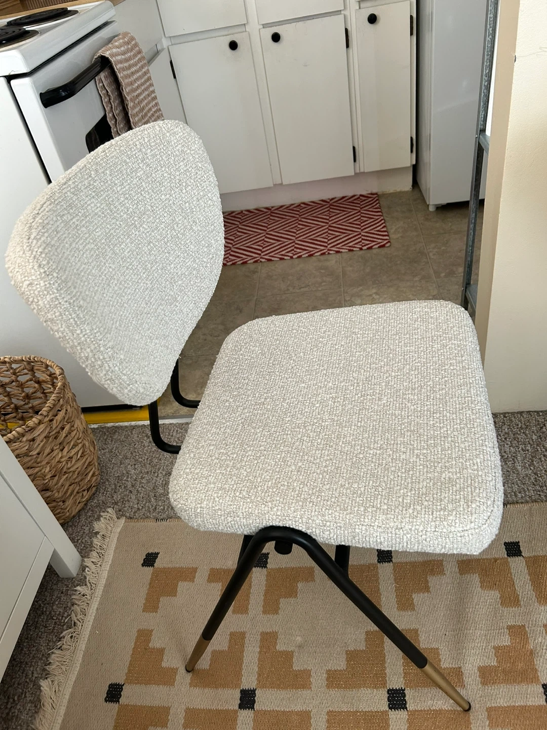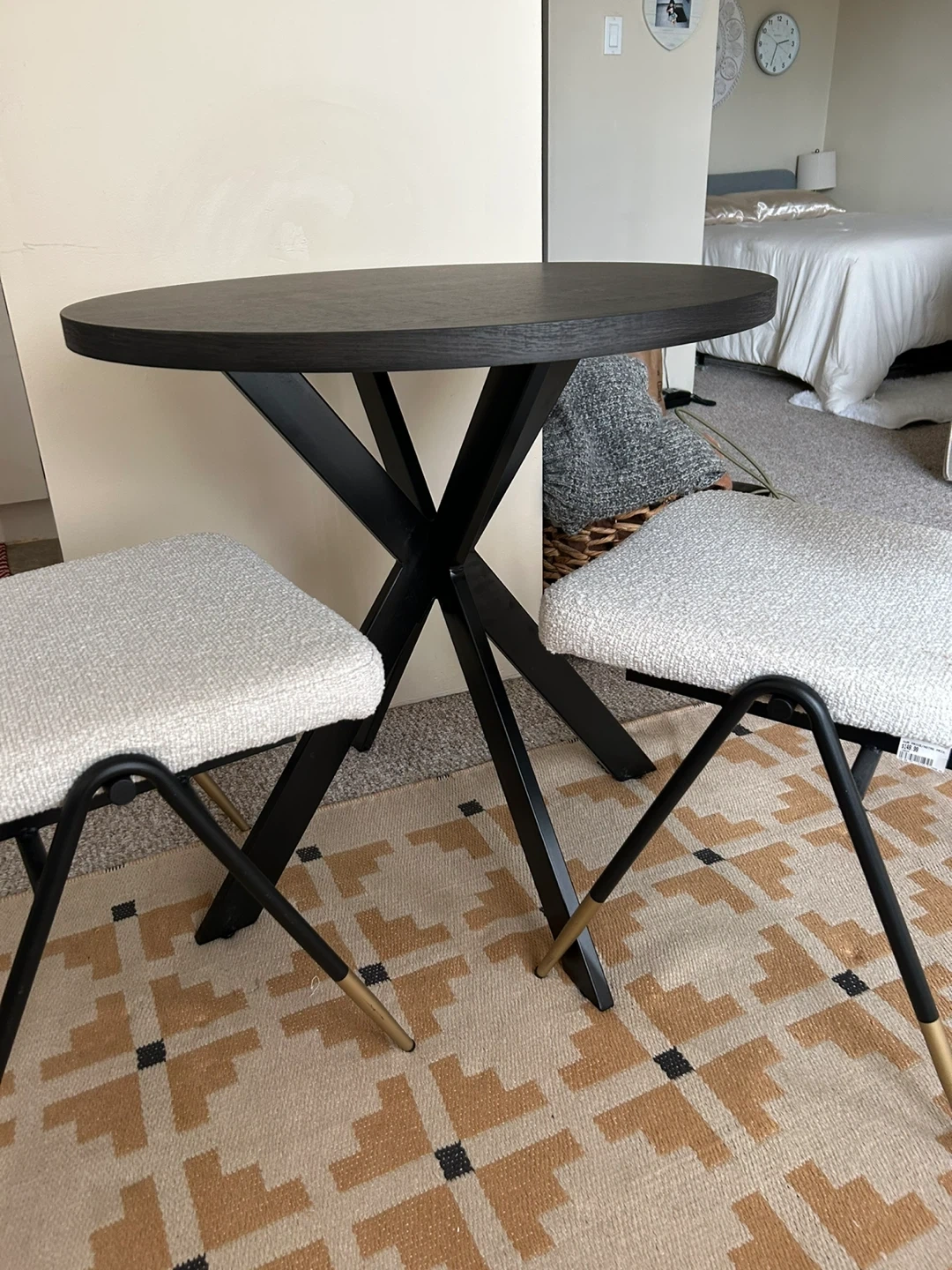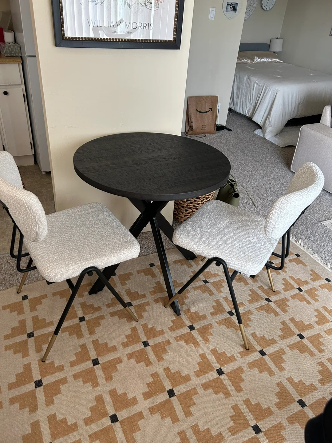 60Selling a HOMCOM dining table with two chairs from winners. The chairs have a unique design with black metal legs and gold accents, and a comfortable, textured white seat. The table is a round, modern design with black /gold steel legs it’s in excellent condition and would be a stylish addition to any kitchen or dining area! Pick up only please