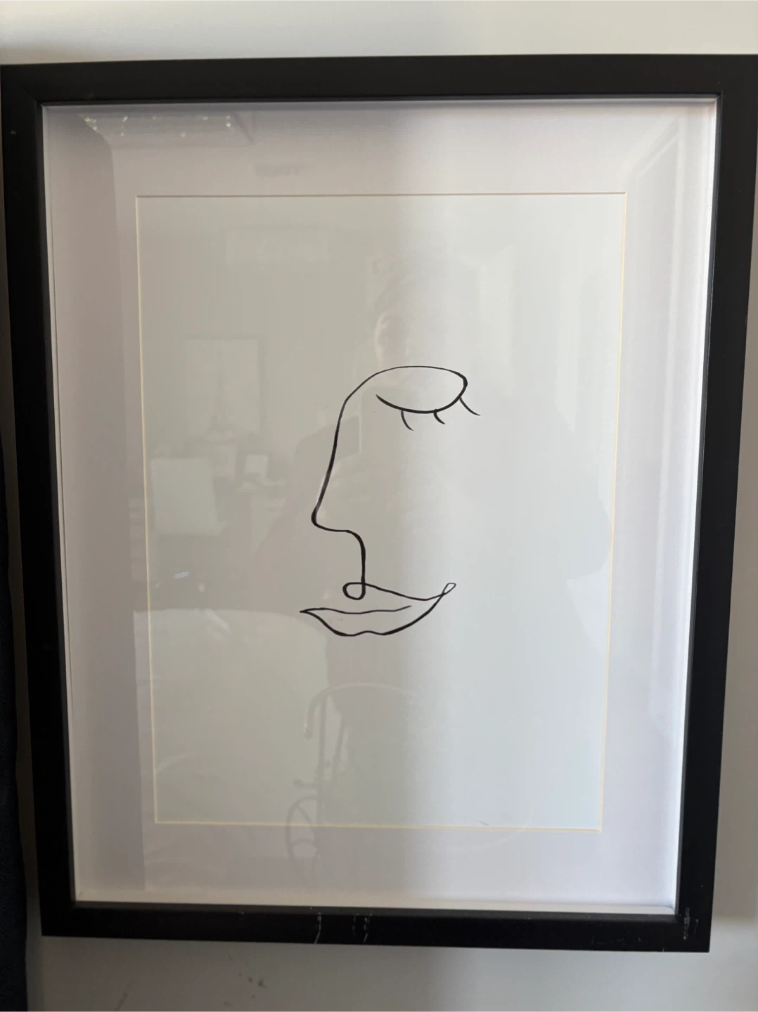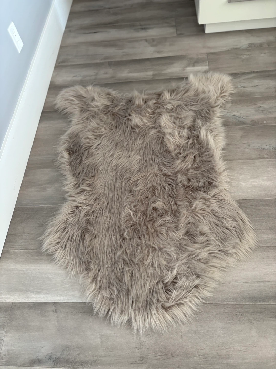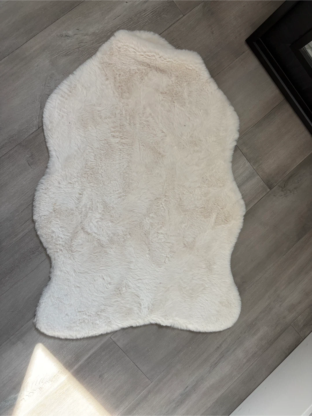 95A collection of home decor items including a vase with flowers, a sheepskin rug, a family rules sign, and a vintage-style clock $20 each