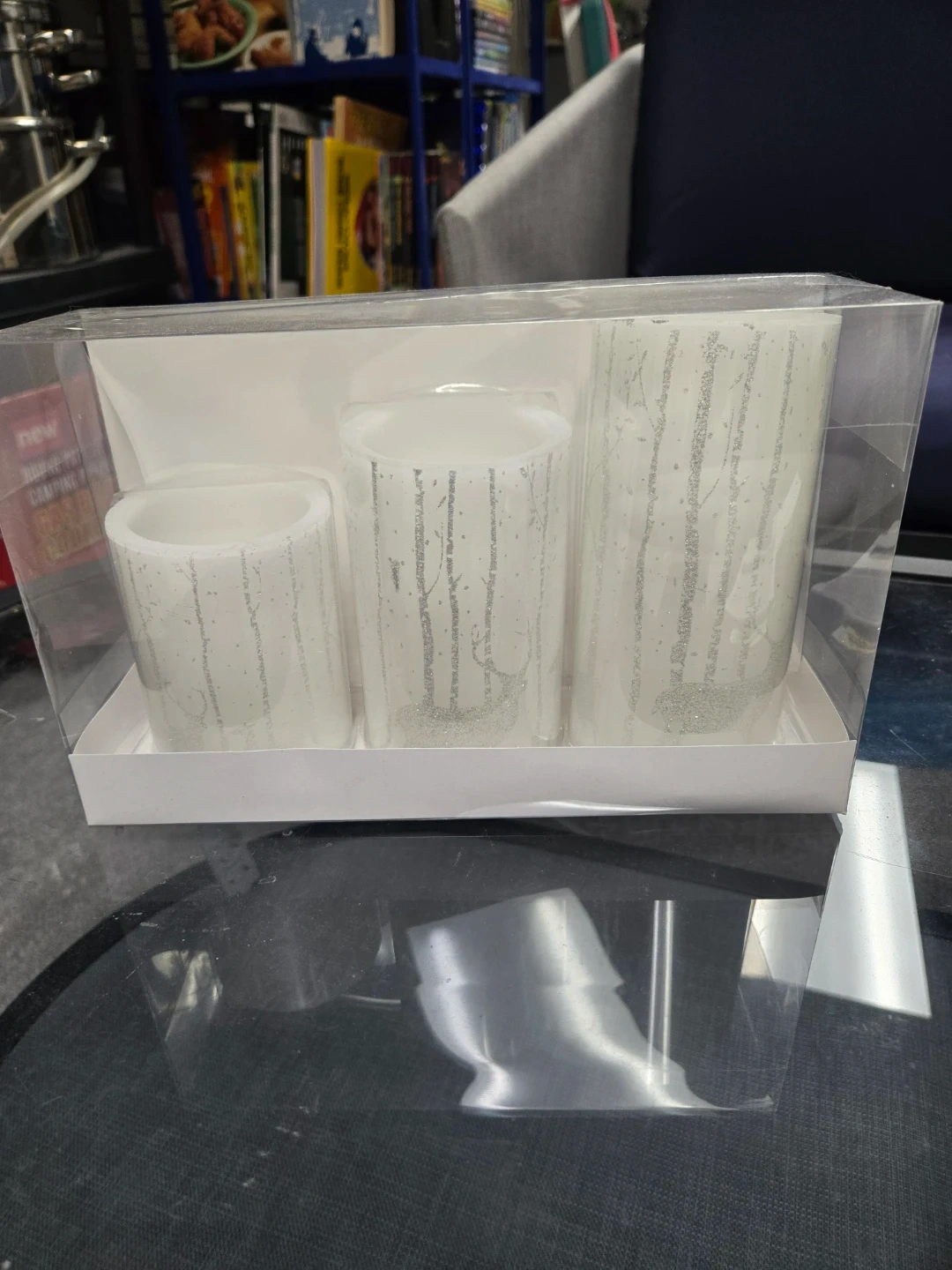 92Selling a brand new Home Styles Glitter LED Candle Set! The set includes three candles of varying sizes: 7.5 cm x 10 cm (3" x 4"), 7.5 cm x 12.5 cm (3" x 5"), and 7.5 cm x 15 cm (3" x 6") Each candle requires 2 AA batteries (not included), and the box is included