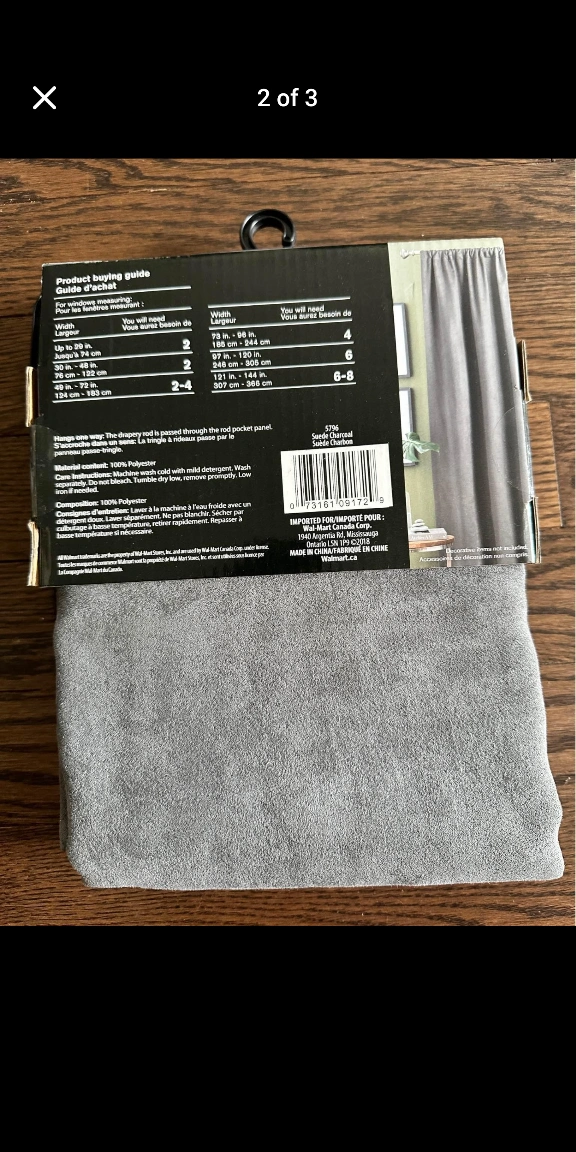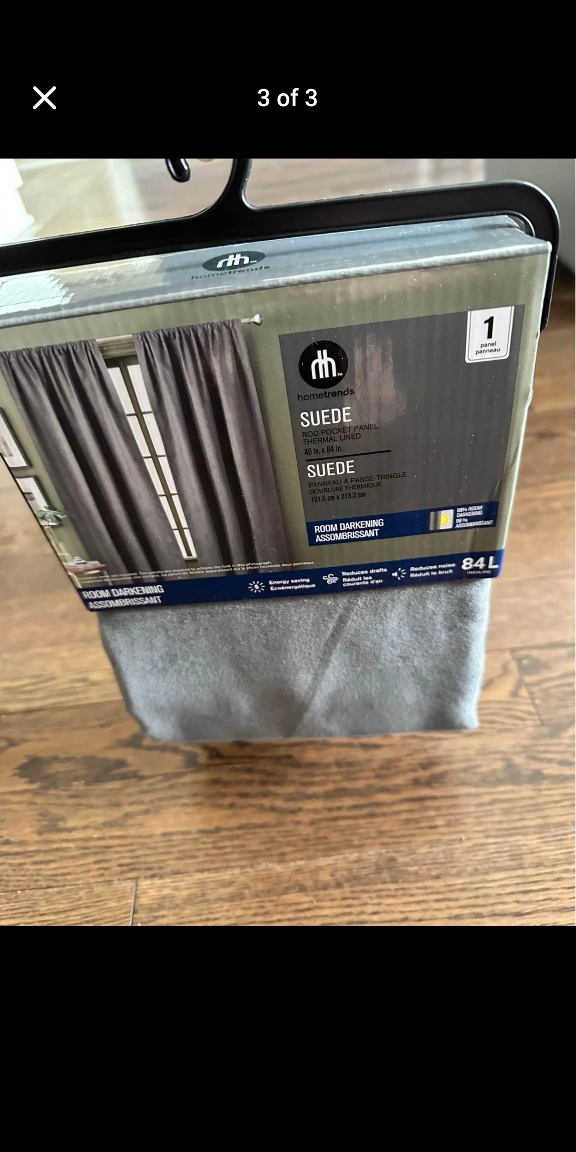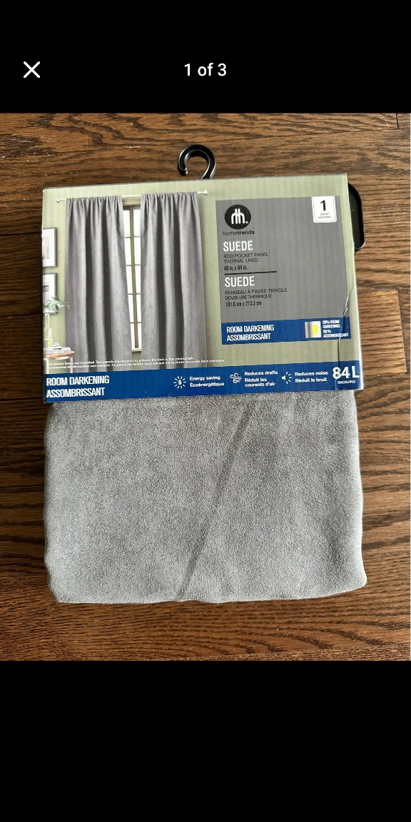 Selling a Home Trends suede curtain panel! It's a room-darkening, thermal-lined panel in an 84L length. The colour is described as 'Suede Charcoal'. It is made of 100% polyester