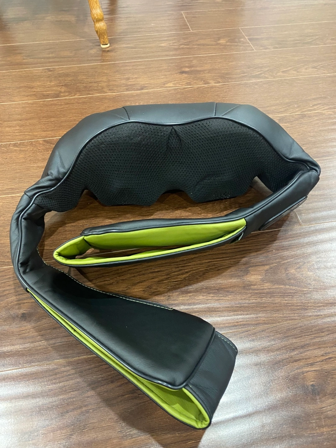 Electric shiatsu massage device. Black and lime green. Relaxing neck and shoulder massage.