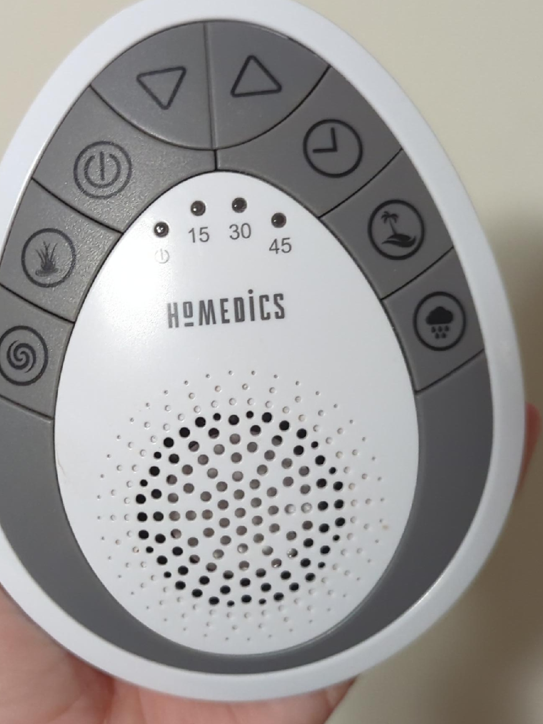 75Selling a Homedics sound machine, perfect for creating a relaxing environment. It has four different sound options and timer settings for 15, 30, or 45 minutes. Great for helping you or your little one drift off to sleep! Battery powered and has a kickstand on the back.