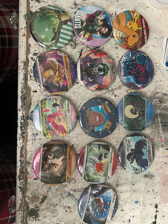 116I make buttons out of trading cards! They are $2 per button and if you have a card you want made into a button, I card $1 extra; additionally, I have Pokémon bulk that I am willing to make into a button, just ask. I also do other cards and the packaging from the cards aswell! You can see those pictured. The mantis button is from those marvel cards you got when you bought groceries at shoppers!! Message me if you have any questions!