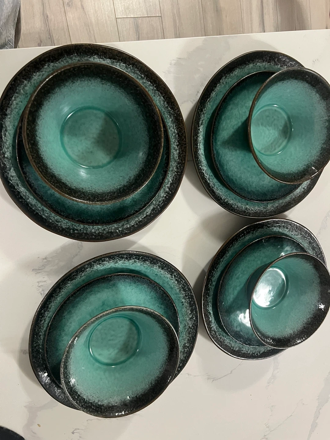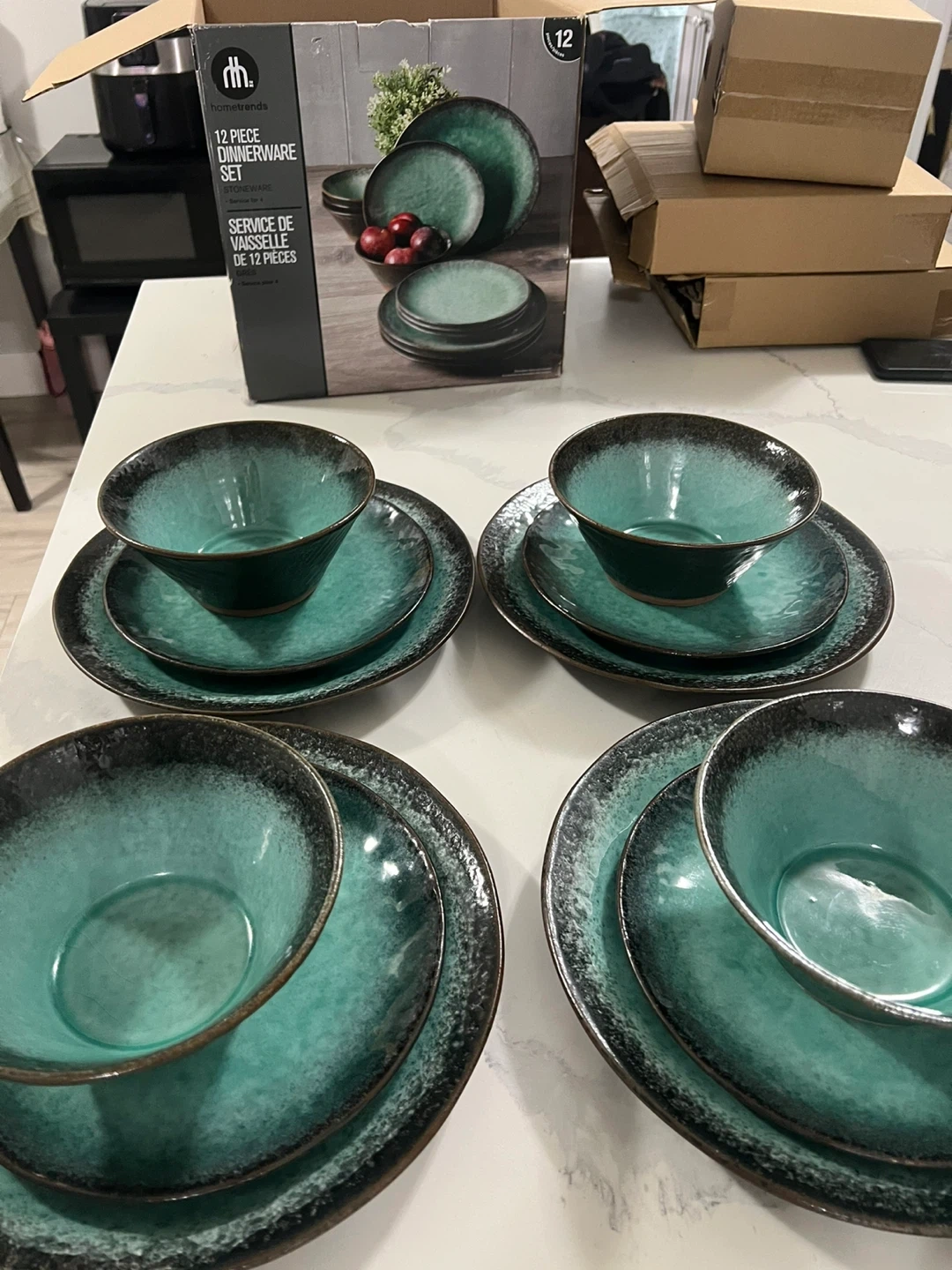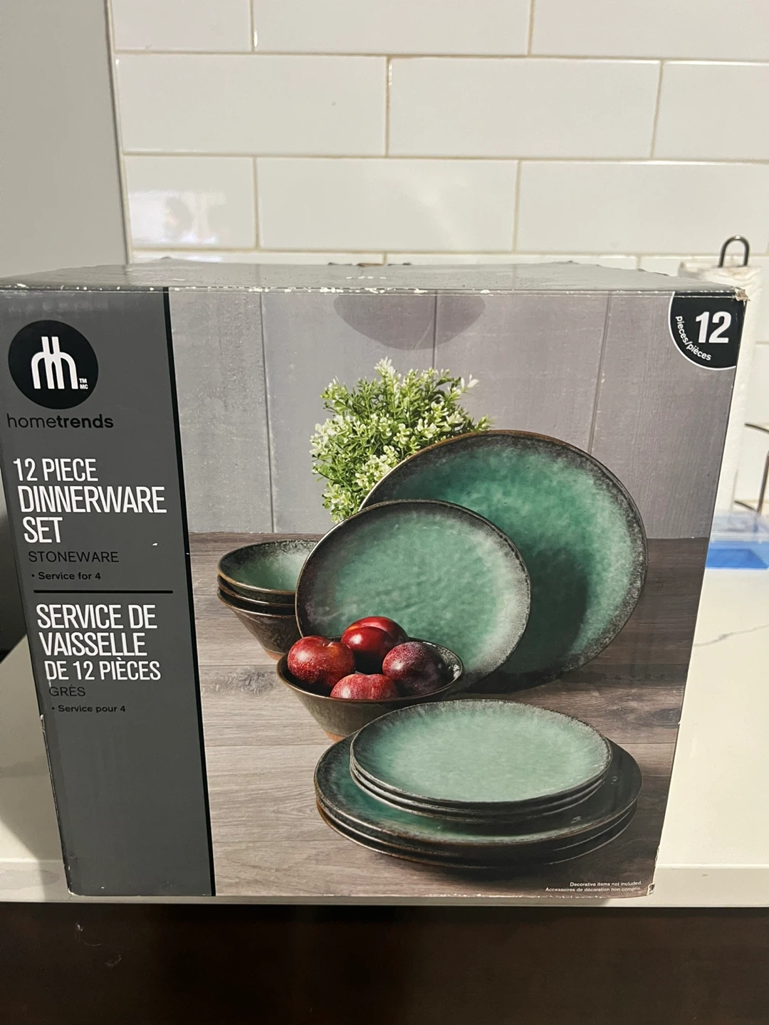 10Brand new ( never used) Moving sale bought for $57 few months ago Selling a hometrends 12-piece dinnerware set, perfect for a service of four. The set is made of stoneware and comes in its original box. It's a beautiful addition to any dining table!