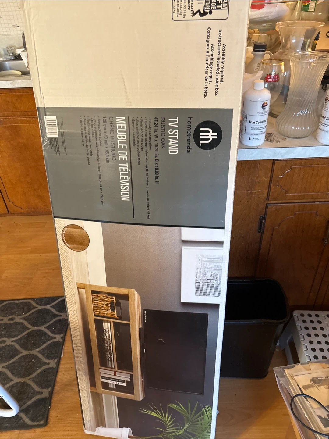 84Selling a hometrends TV stand in rustic oak. It's sturdy and can hold a flat screen television up to 42 inches (maximum weight 45 kg). It can also be used as a coffee table. Dimensions are 47.24 in. W x 15.75 in. D x 19.09 in. H (120 cm x 40 cm x 48,5 cm). Assembly is required, and the instructions are included in the box!