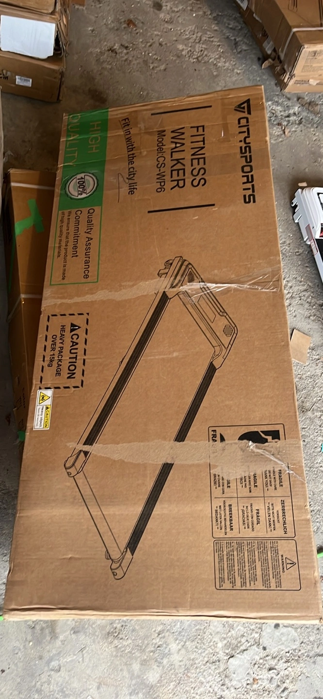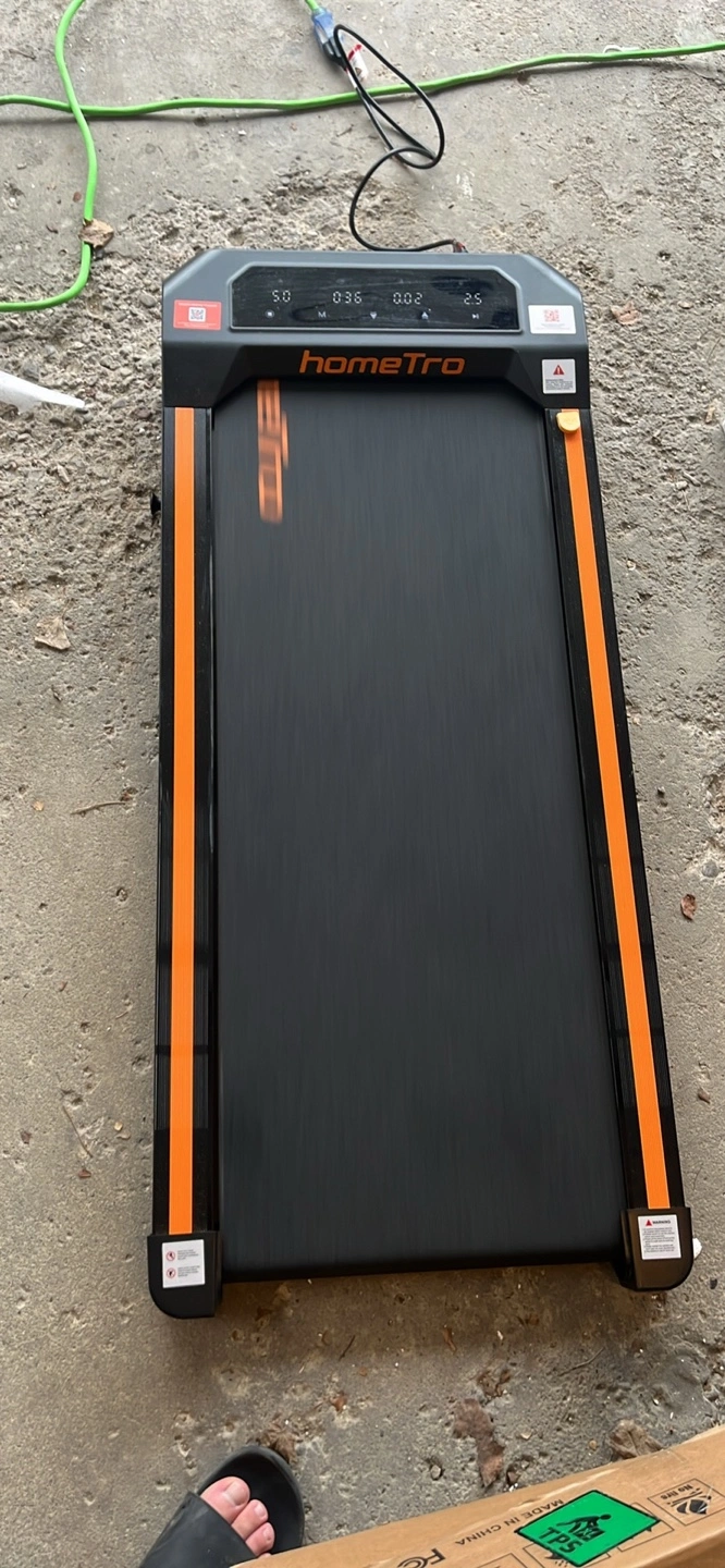 Brand new, still in box. Compact walking treadmill. Ideal for home use. Features a digital display. Orange side accents. Great for light cardio.