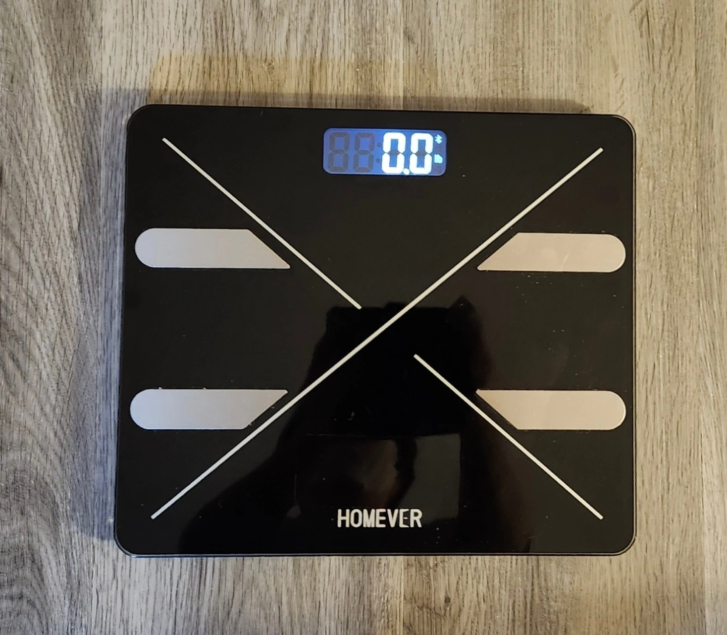 Digital bathroom scale. Black with white accents. Features a large LCD display.