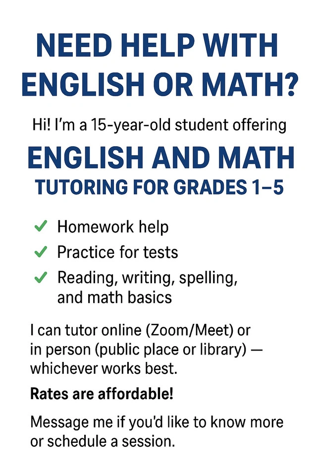 Hi I’m a 15-year-old student offering tutoring for elementary and middle school students (grades K–8). I can help with most subjects — including math, reading, writing, science, and homework support. I’m patient, responsible, and enjoy helping younger students understand their work better. Whether your child needs help catching up, staying on track, or getting ahead, I’ll make sure our sessions are clear, focused, and encouraging. Details: • Rate: $20/hour • Subjects: All core subjects (Math, English, Science, Social Studies, etc.) • Location: I can meet at a local library, your home , or online via • Availability: After school and weekends Job Type: Please Contact Job Offered By: Individual