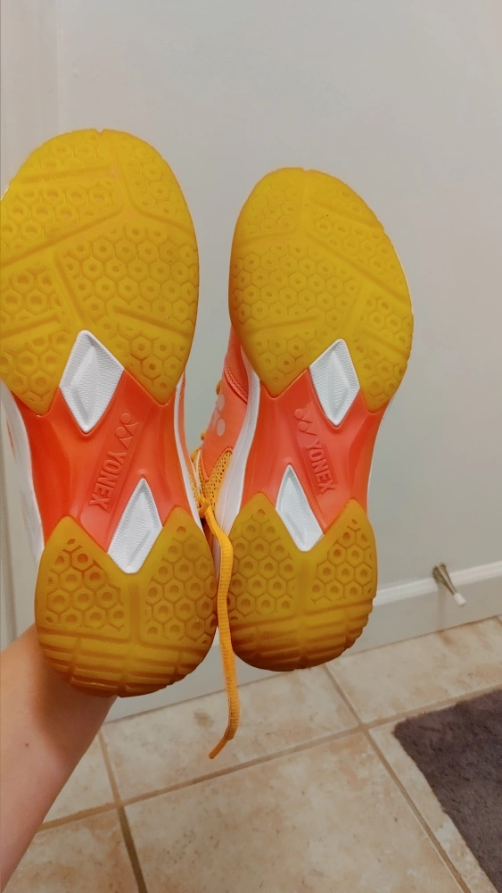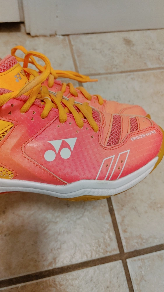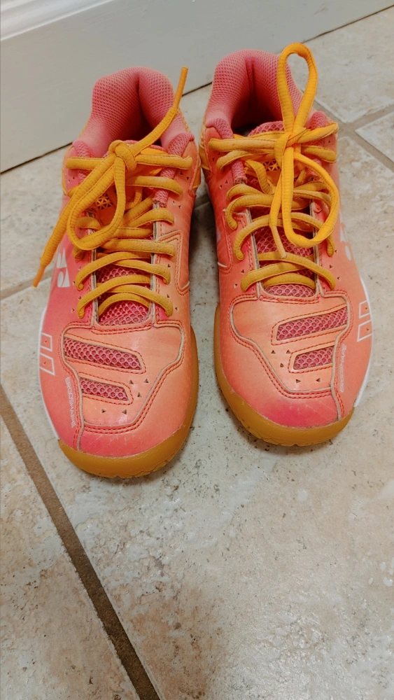 Yonex shoes in a vibrant pink and orange colourway. These shoes feature a lace-up closure for a secure fit. Excellent condition