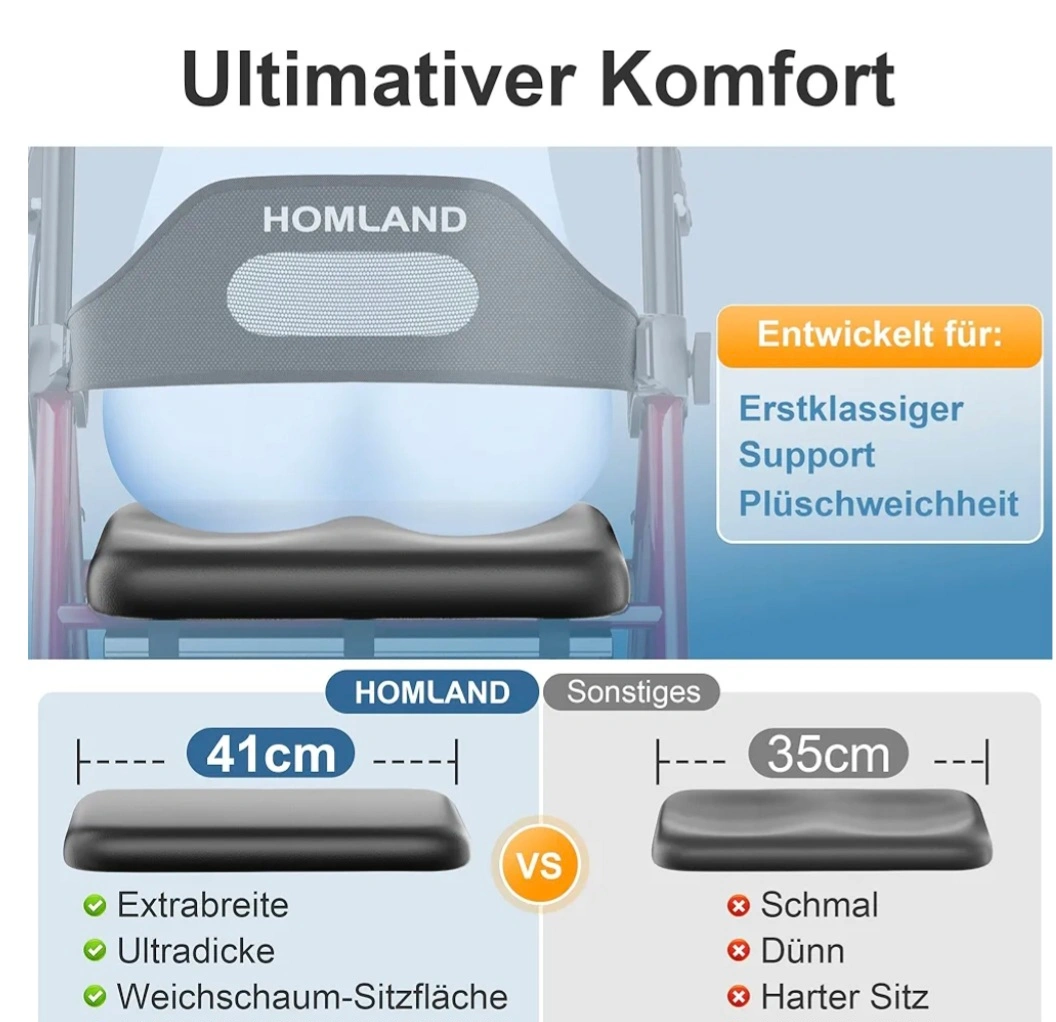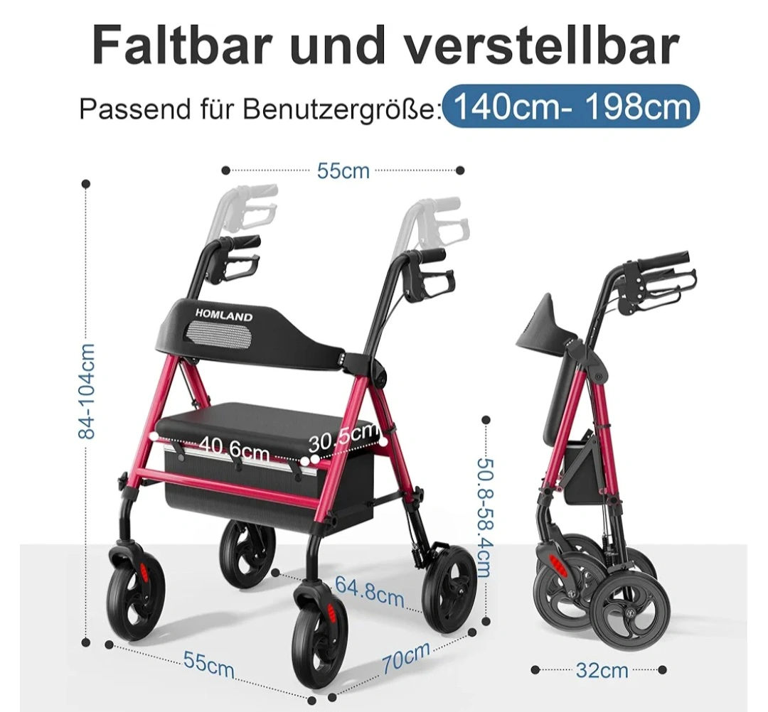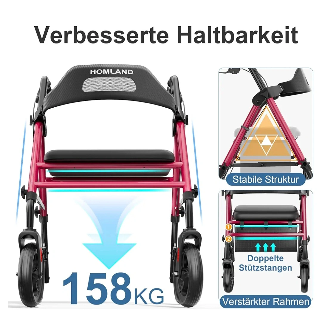 10This Homland rollator walker provides stability and comfort while walking. It's foldable for easy storage and transport. The seat offers a place to rest when needed. Supports up to 158KG. Suitable for user height 140cm-198cm