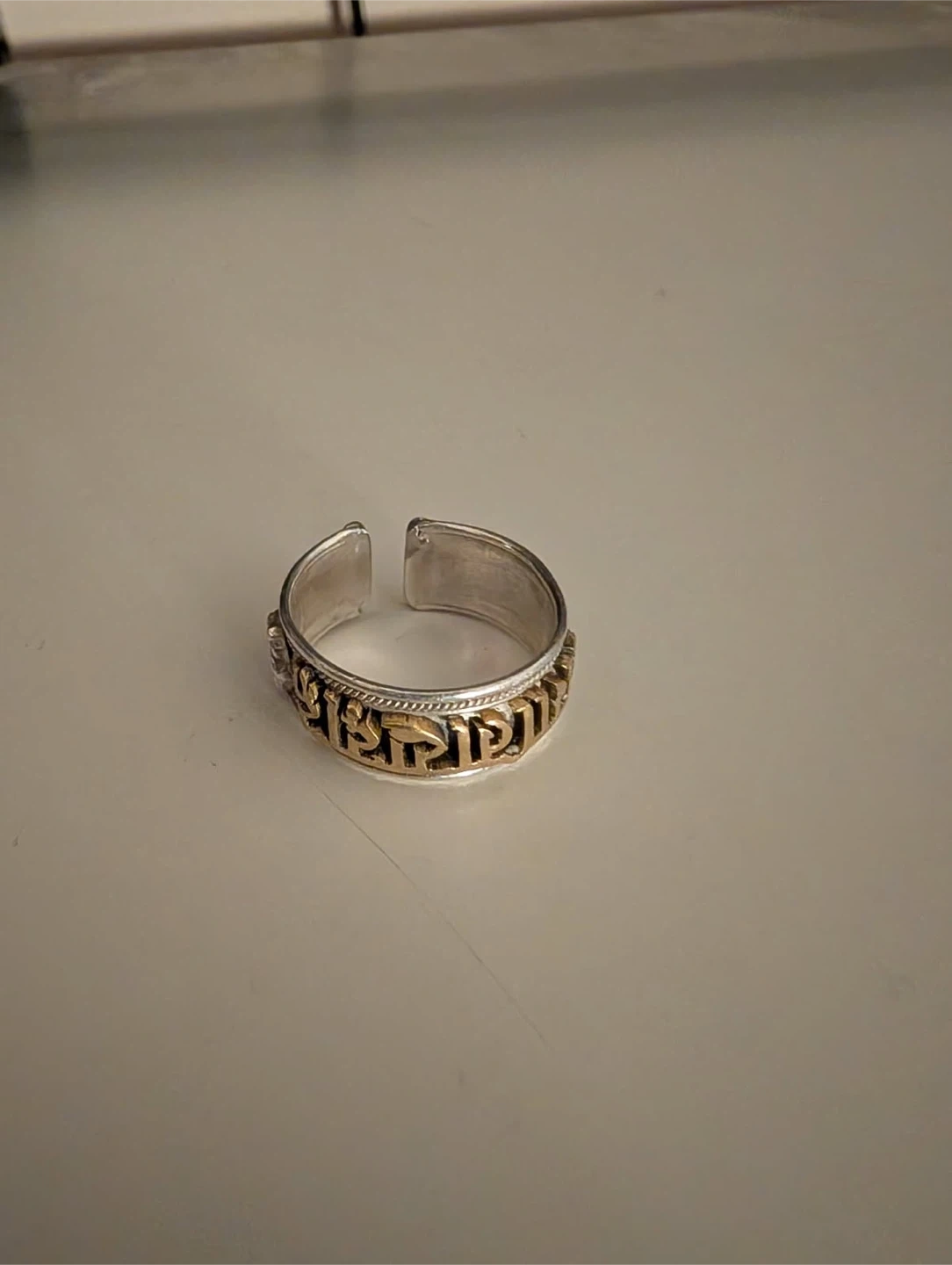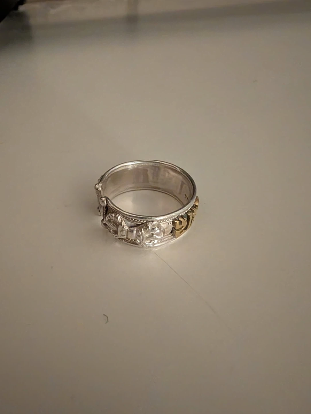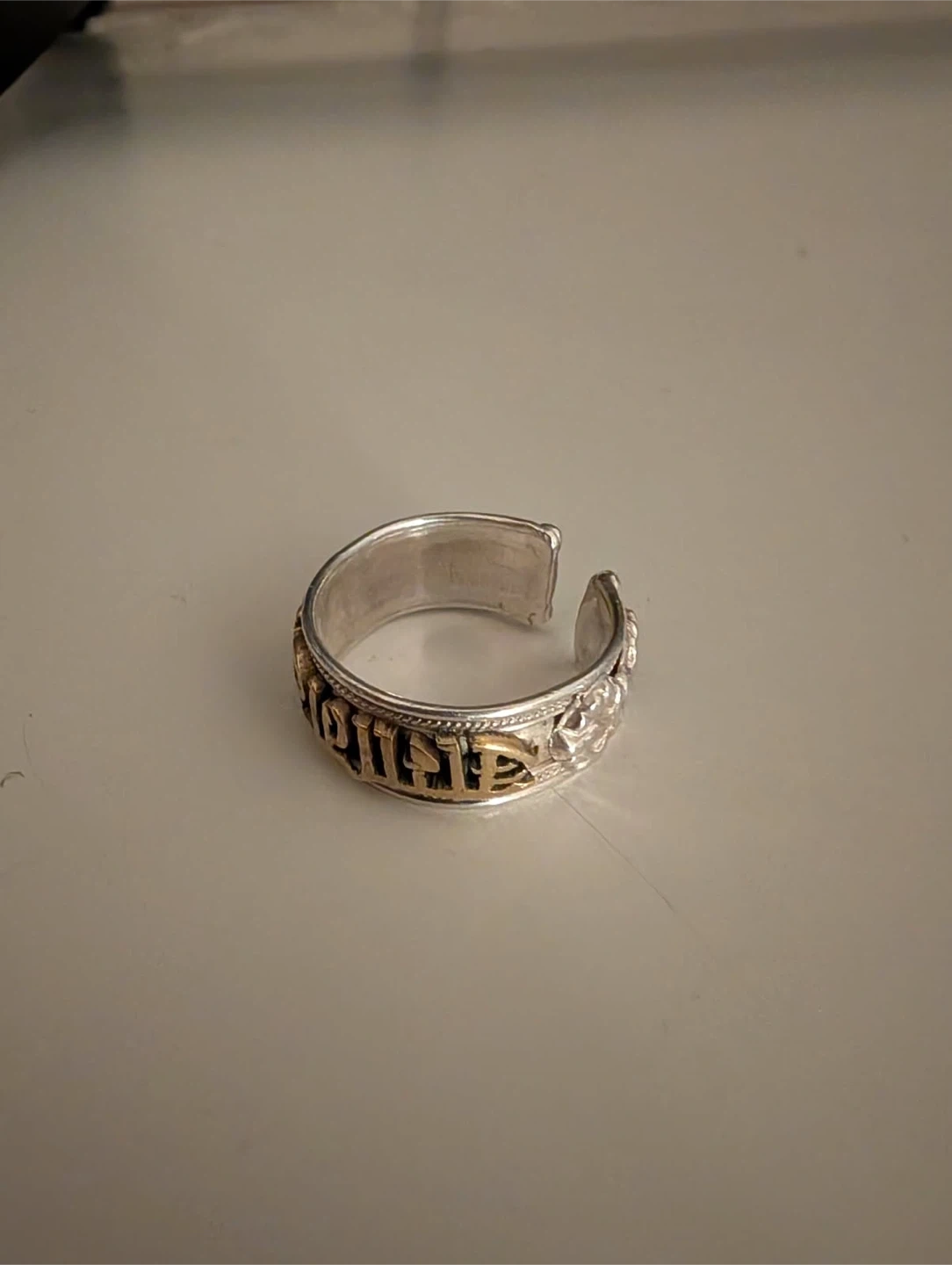 This is a silver ring with an adjustable band. It features decorative engraving around the edges and a gold-toned inscribed band. It's made of sterling silver.