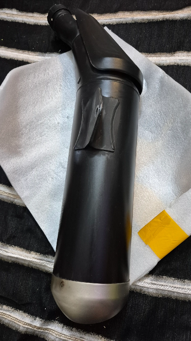 Selling a used motorcycle exhaust muffler. It's black and its in good condition. It has never been dropped and has no scratches.