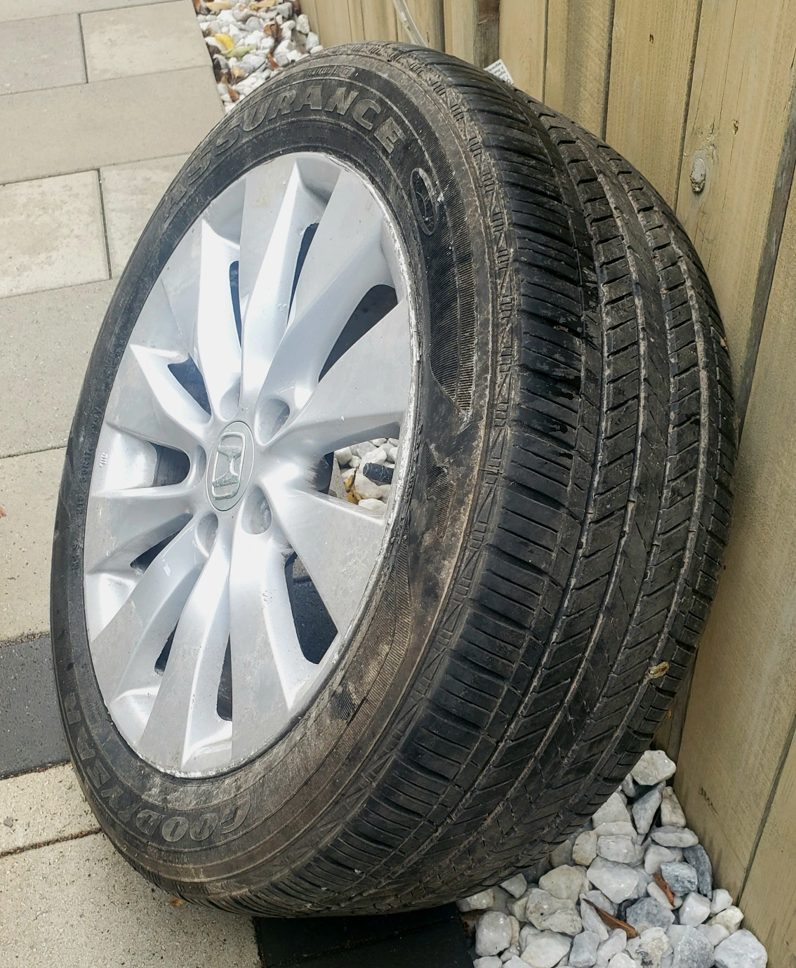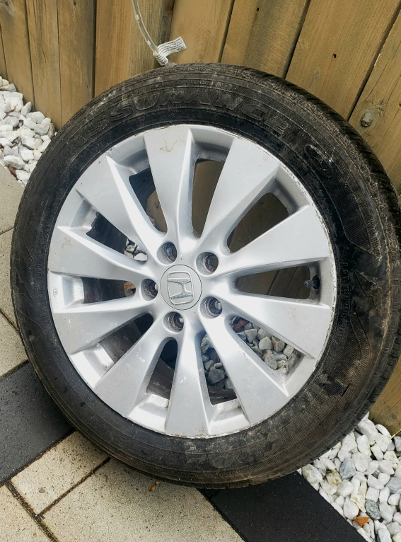 10Selling a Honda wheel with a Goodyear tire. The tire size is 215/55R17. It's in used condition, as you can see in the photos.