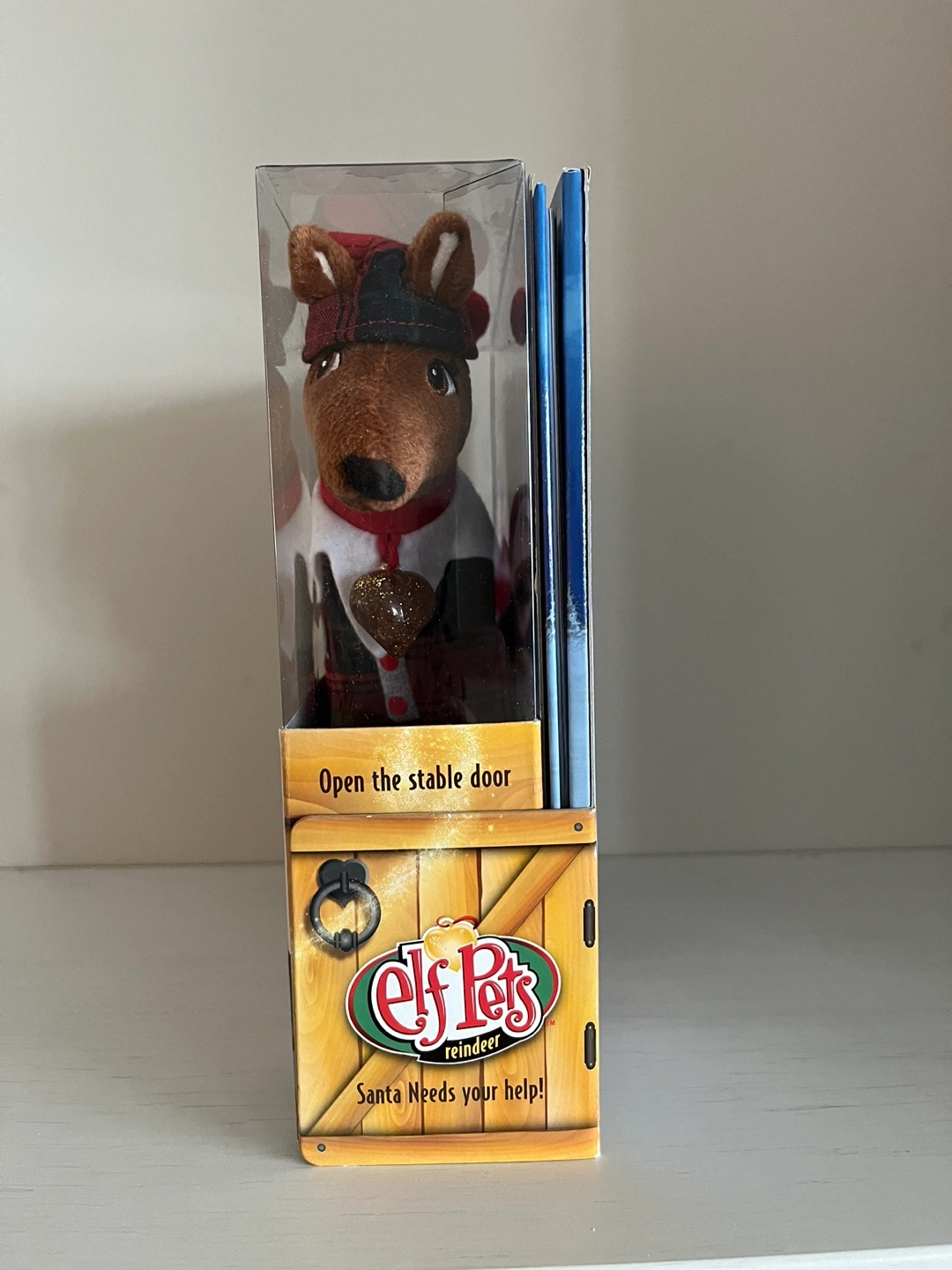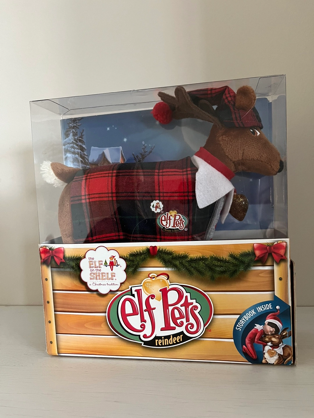 Elf on the Shelf Pet Reindeer toy in a red and black plaid outfit. Comes with a storybook.