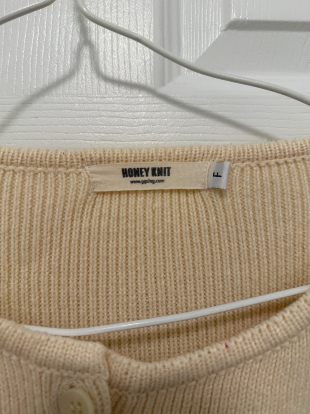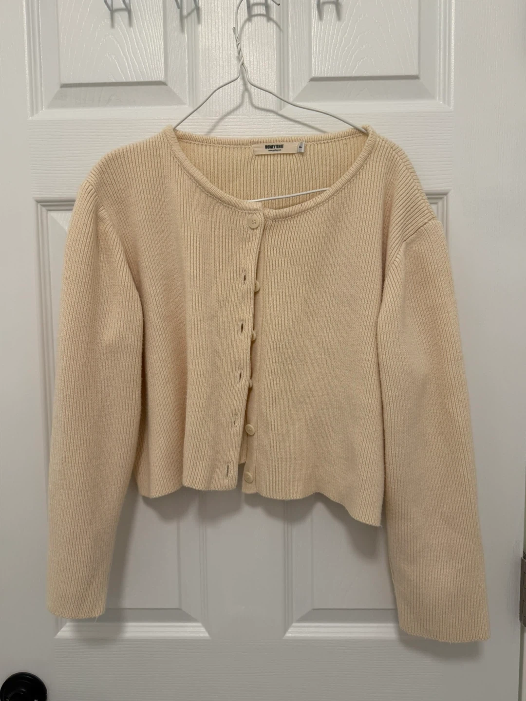 32Selling a lovely cream-coloured cardigan from Honey Knit in a size L. It's in great condition and ready for a new home! The material is soft and cozy, perfect for layering or wearing on its own. It features a classic button-down design that's easy to style with any outfit