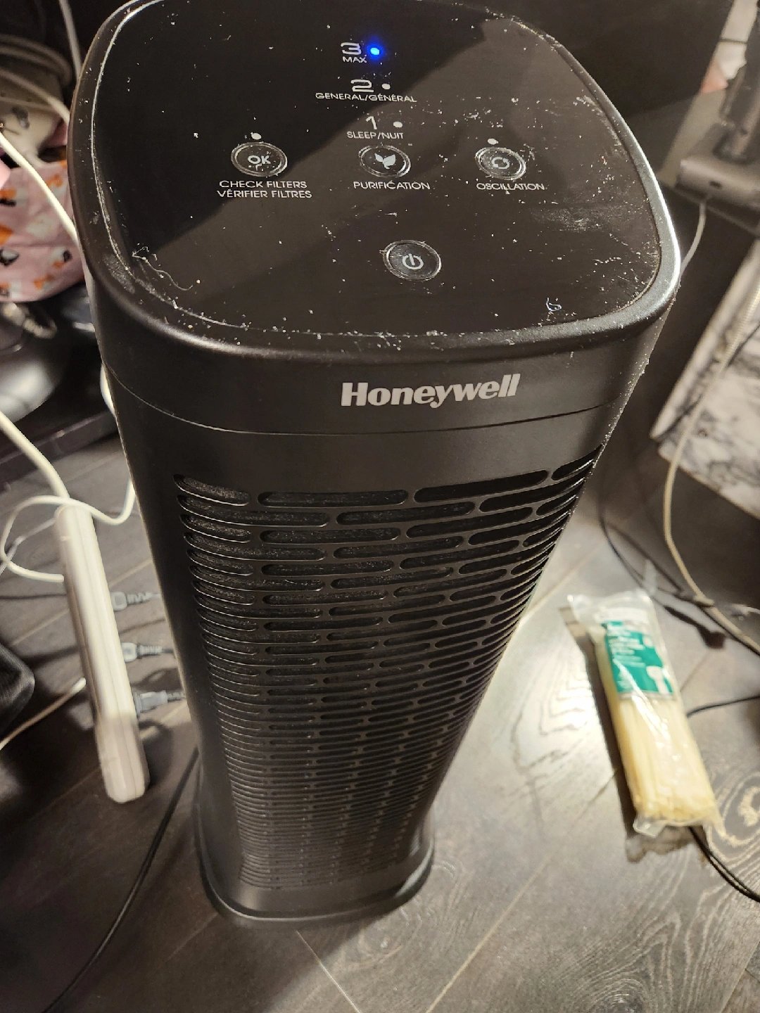 59Selling a Honeywell air purifier. It has settings for general use, sleep/night, purification, and oscillation. Also has a filter check indicator.