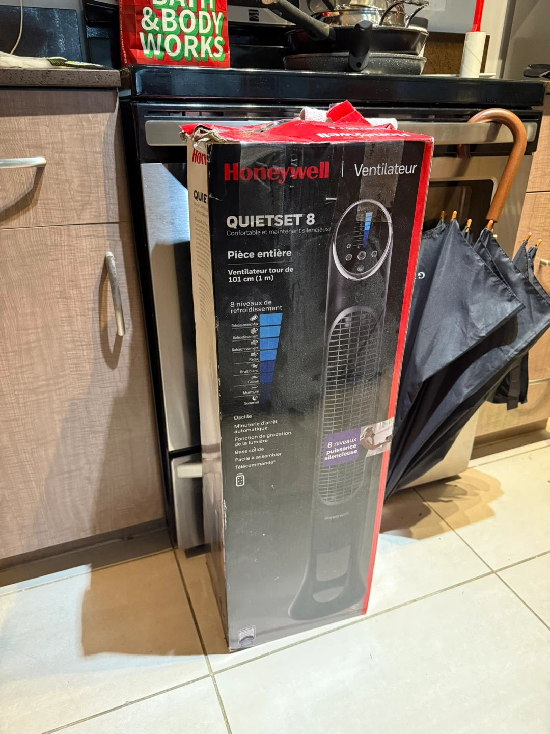 Selling a Honeywell QuietSet 8 tower fan. It's in great condition and comes in the original box! This fan is perfect for keeping cool and comfortable, and it's super quiet. Features include: - 8 levels of cooling - Oscillation - Timer - Dimming feature - Remote control