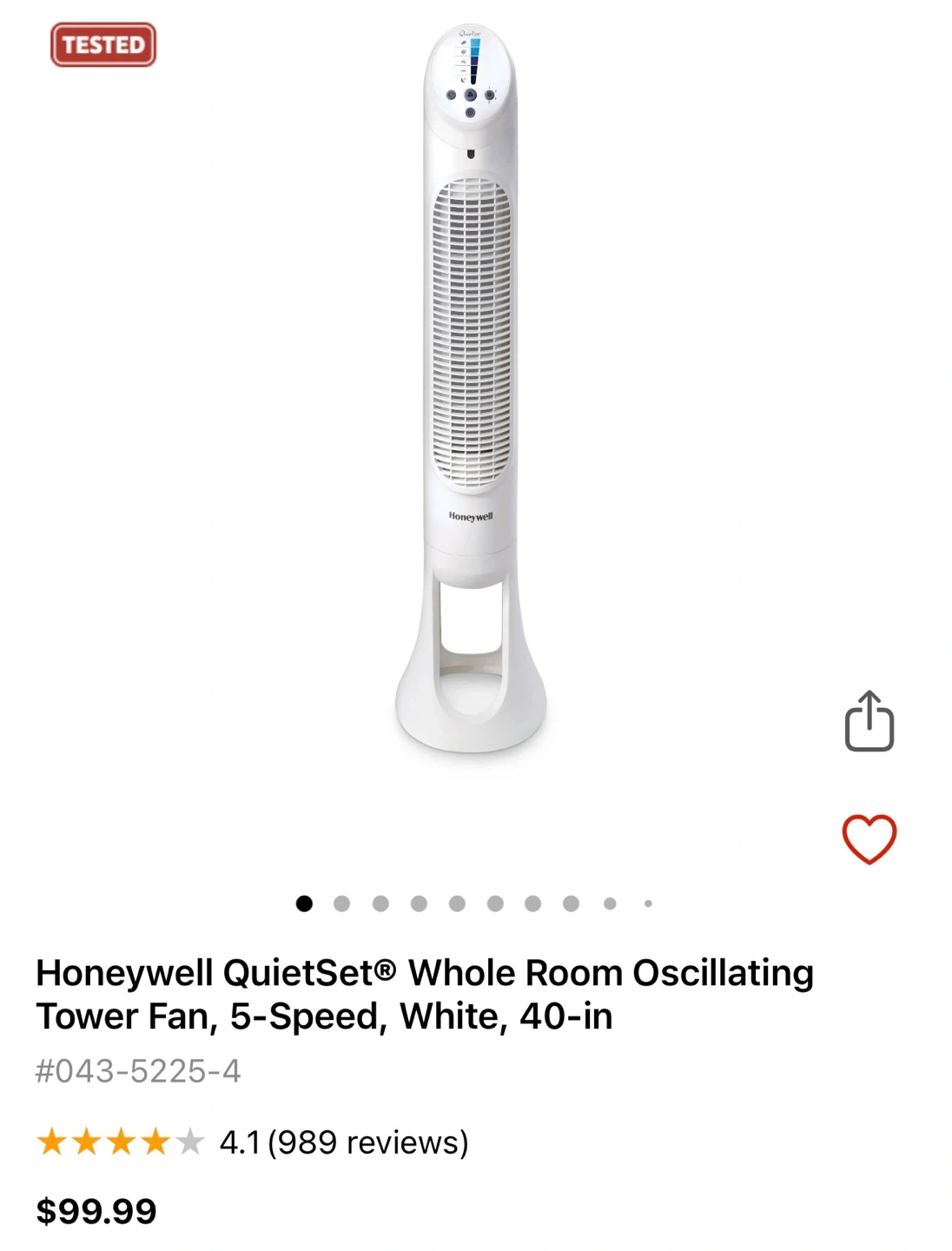 15Keep cool with this Honeywell QuietSet Whole Room Oscillating Tower Fan! It features 5 speeds and stands at 40 inches tall. It also comes with a remote! Originally bought for $99.99