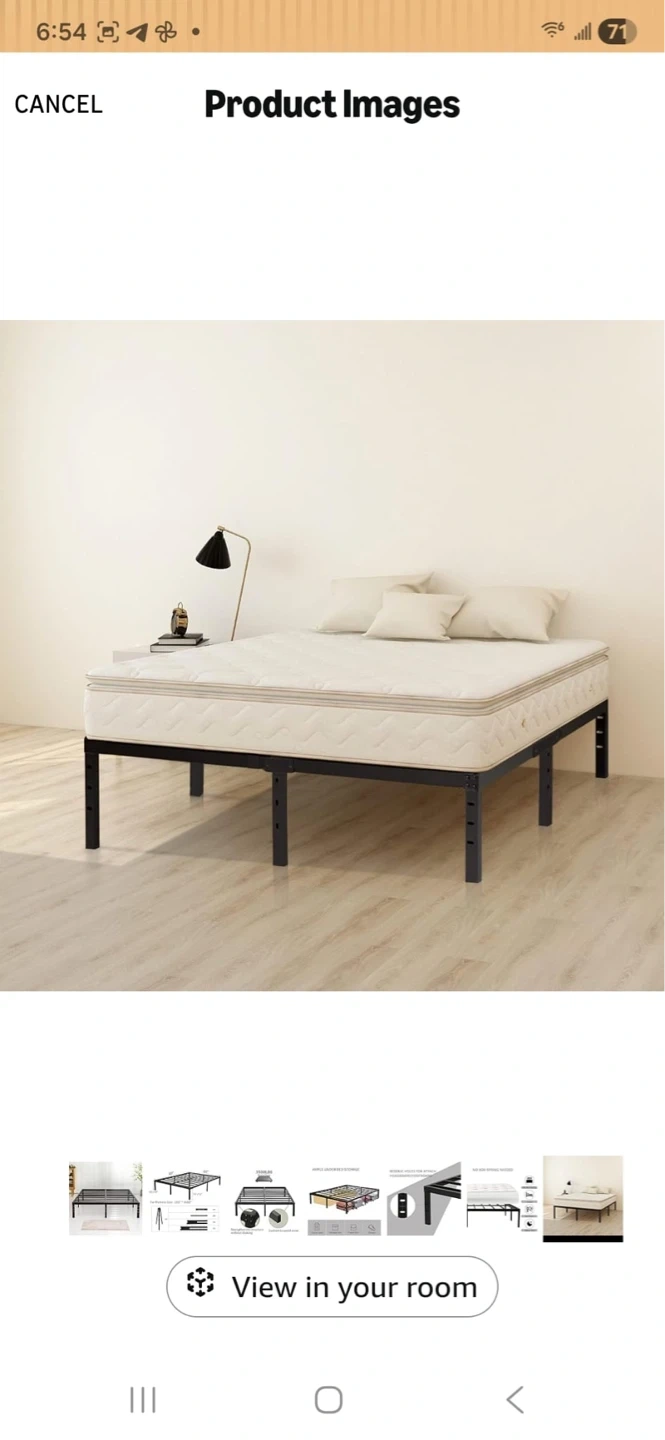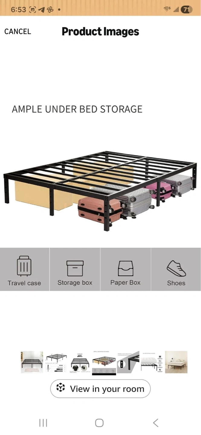 Queen size metal bed frame. Supports up to 3500 lbs. Ample under-bed storage space. Designed to strengthen the structure and cushion to avoid noise.