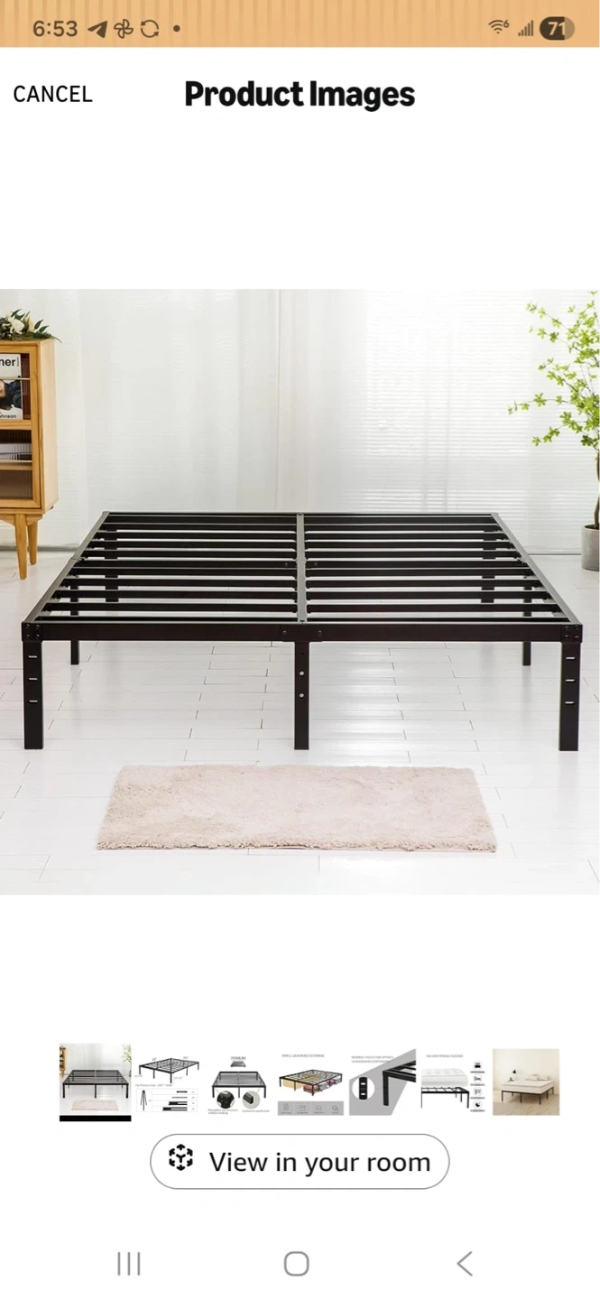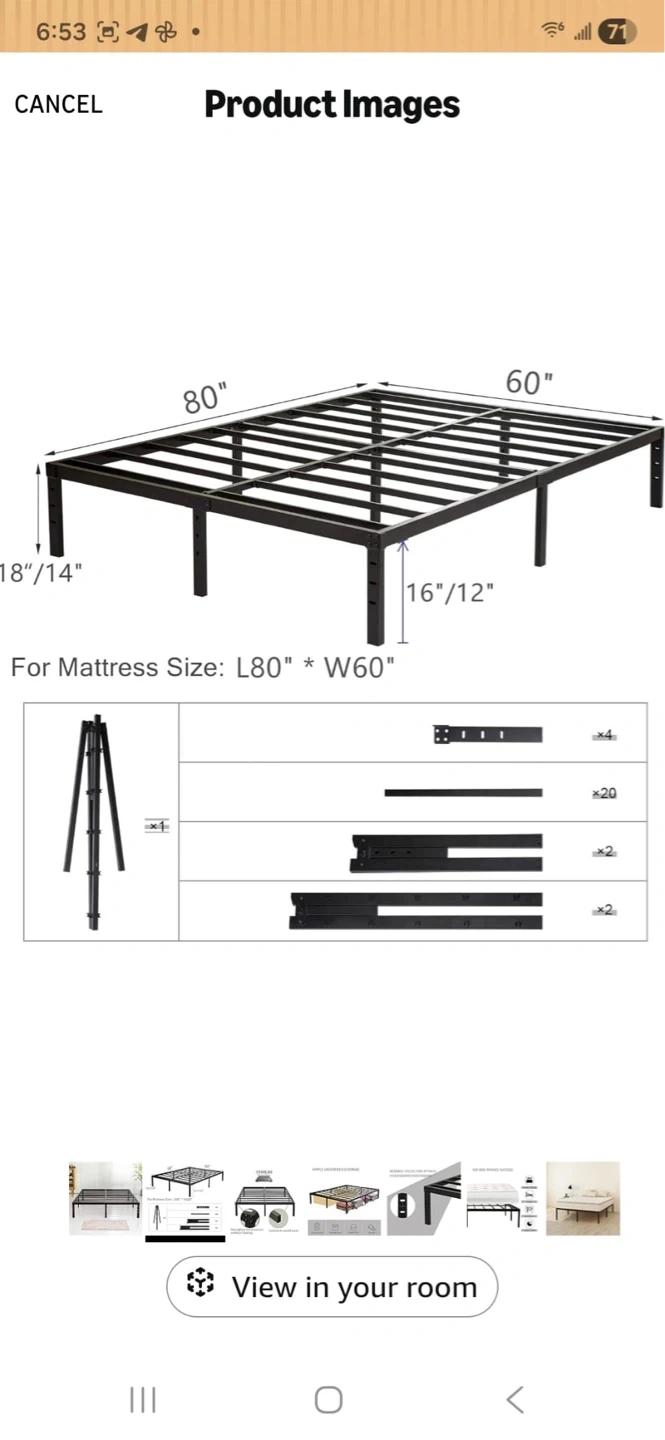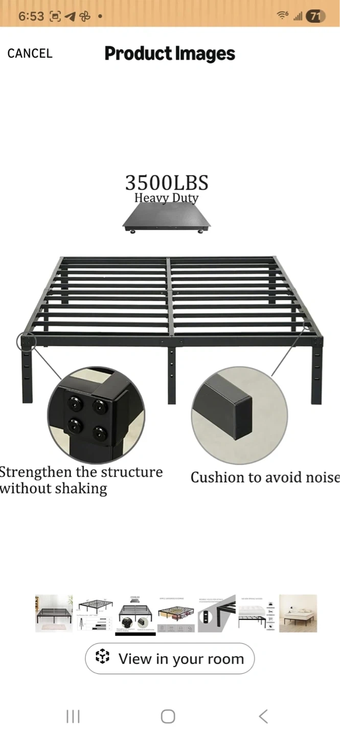 Queen size metal bed frame. Supports up to 3500 lbs. Ample under-bed storage space. Designed to strengthen the structure and cushion to avoid noise.