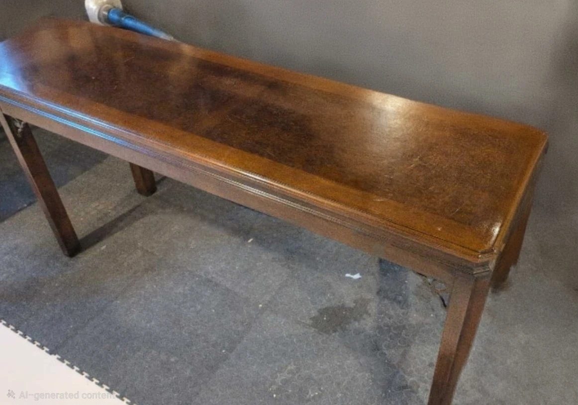 A narrow, dark wood console table with decorative trim. It's a classic style that fits many decors. This table is useful for entryways or behind a sofa. Open to offers and trades