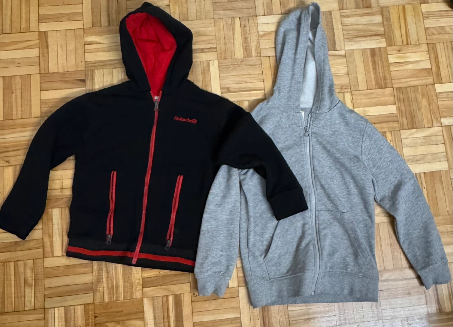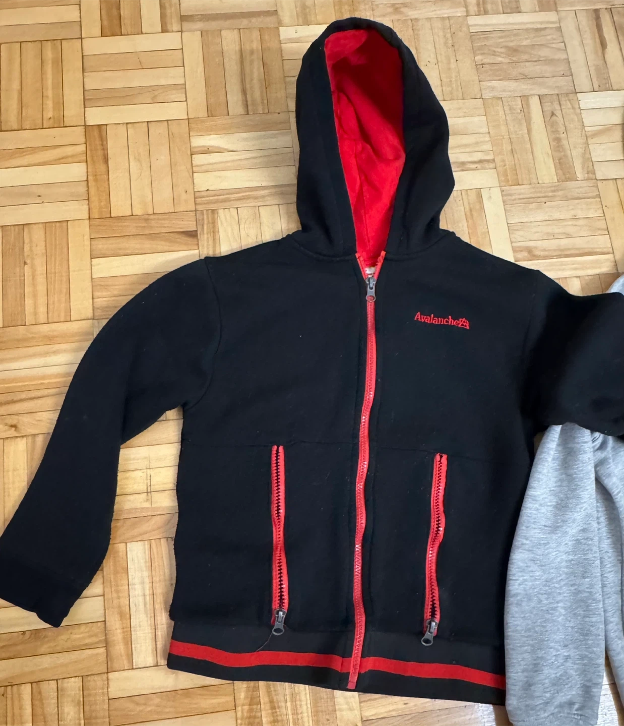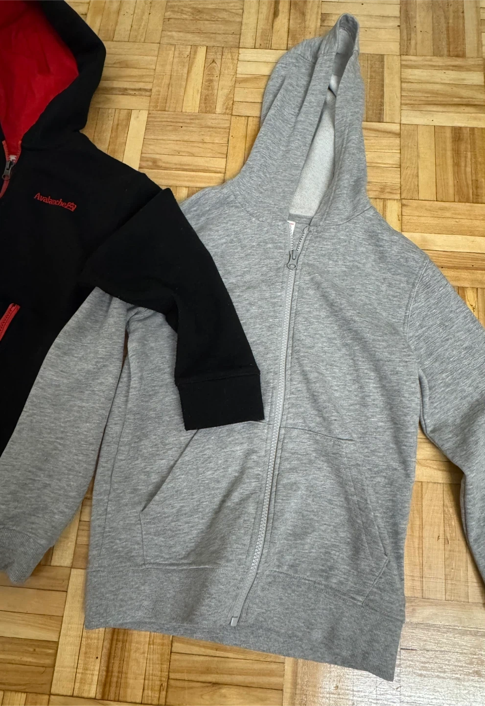 Two hoodies for sale! One is an Avalanche brand black hoodie with red accents, and the other is a Joe Fresh brand light grey hoodie. Both are size 7/8 and in great condition. Perfect for layering on cooler days!