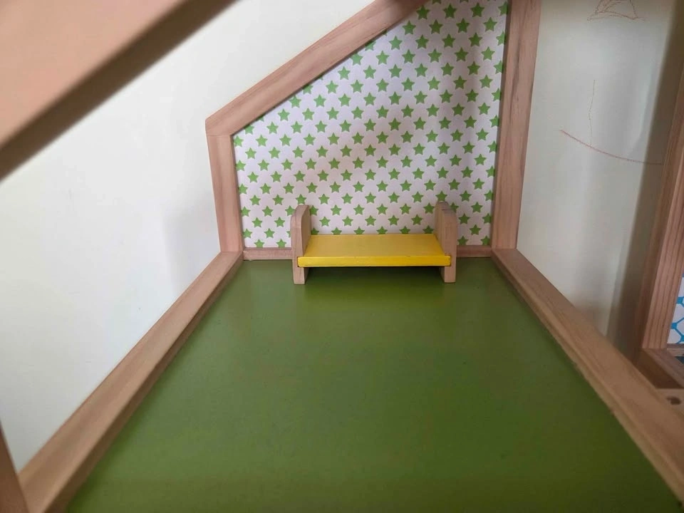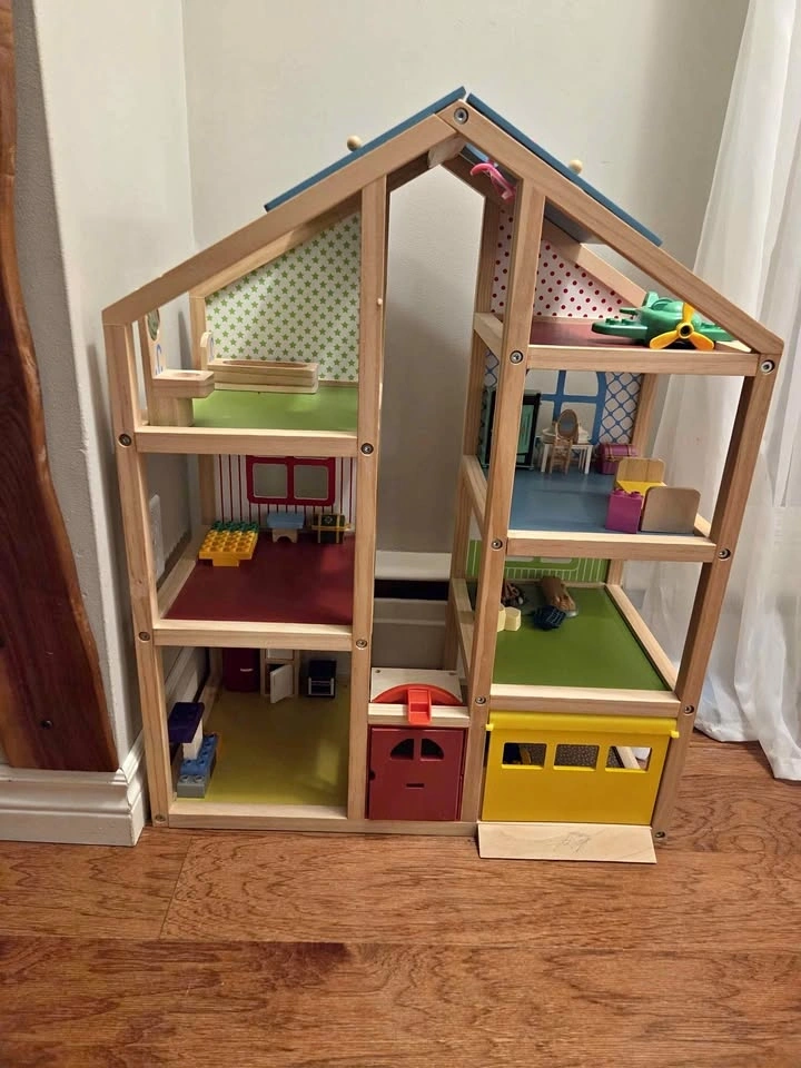 Excellent condition wooden dollhouse. Sturdy. Front door opens and elevator goes up/down. Garage door opens. All wooden accessories included.