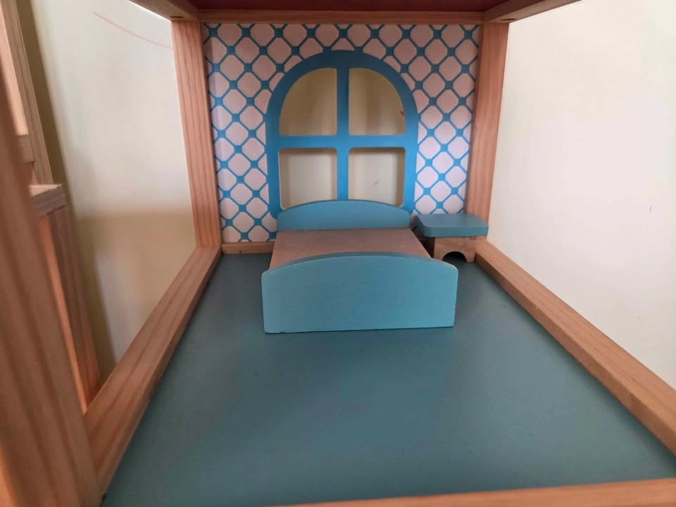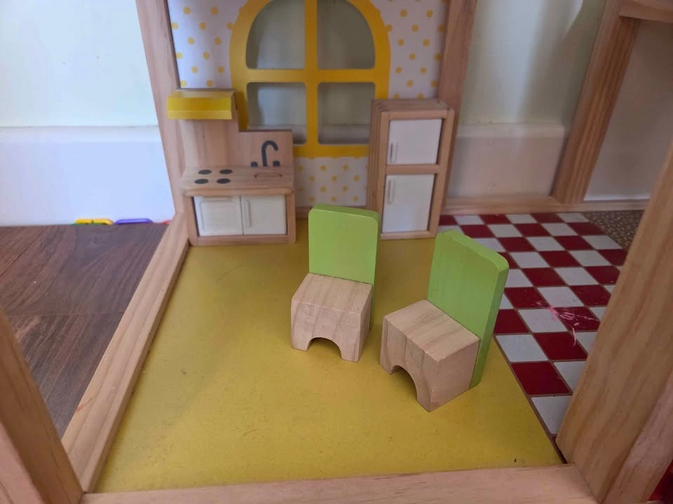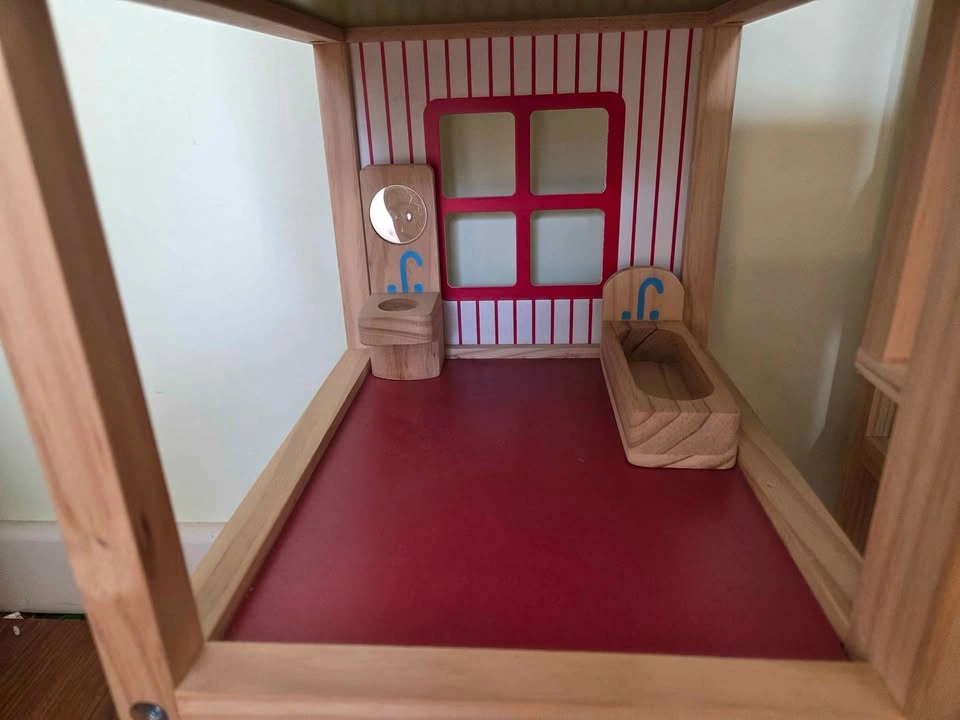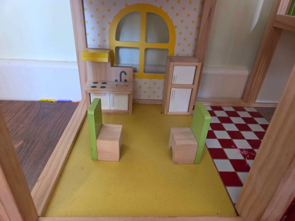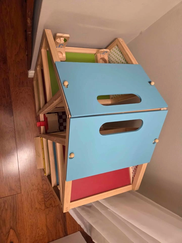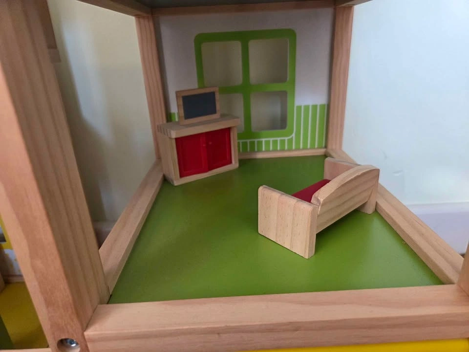 Excellent condition wooden dollhouse. Sturdy. Front door opens and elevator goes up/down. Garage door opens. All wooden accessories included.