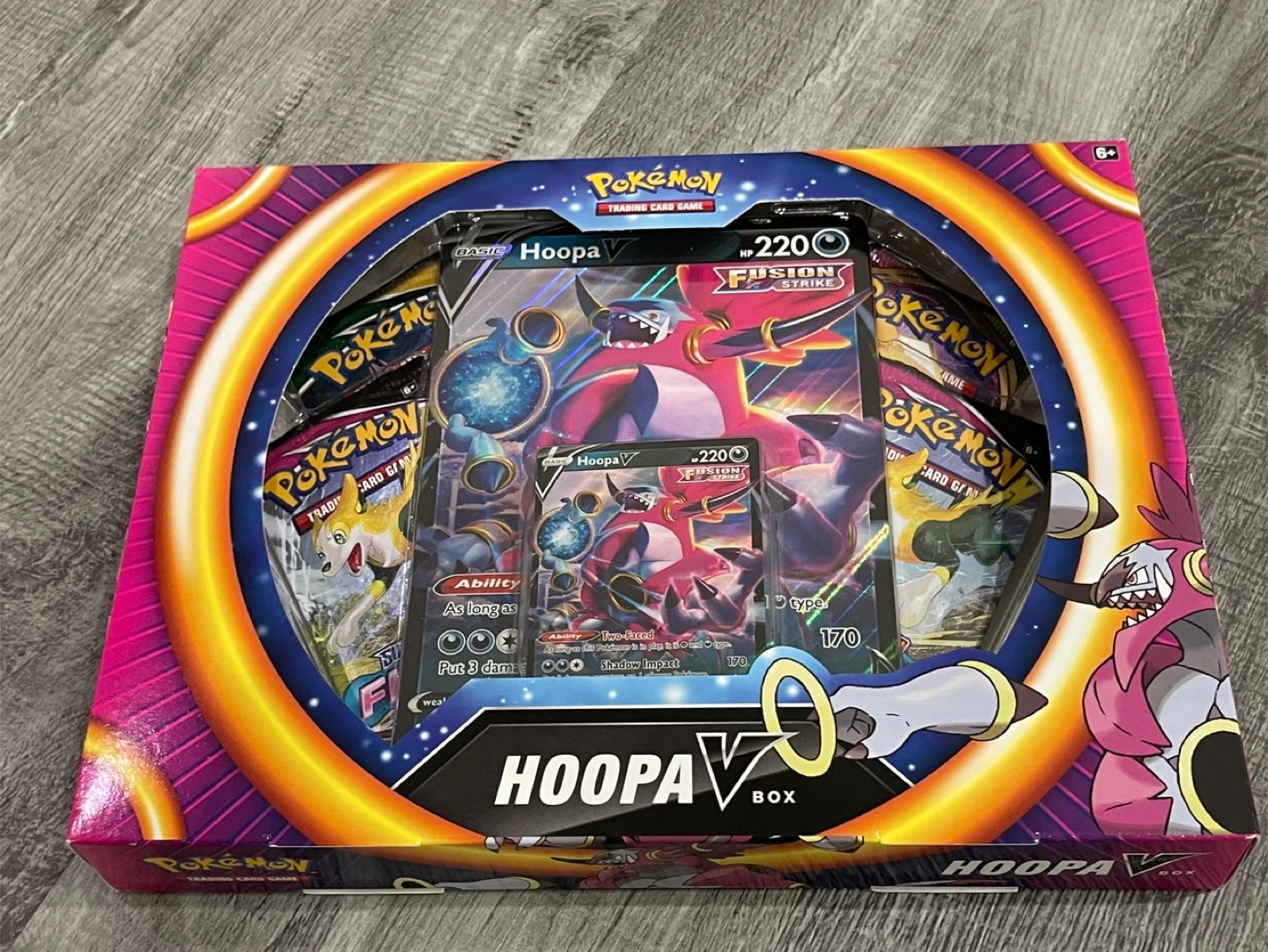 5Selling a sealed, brand new Hoopa V Box. The box contains: • 1 Foil Card Featuring Hoopa V • 1 Oversized Card Featuring Hoopa V • 4 Pokemon Booster Packs (1x Evolving Skies, 1x Vivid Voltage, 2x Fusion Strike) • a Code card for the Pokemon TCG online game.