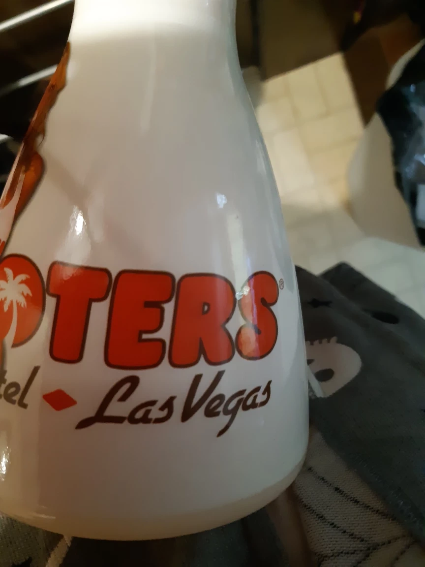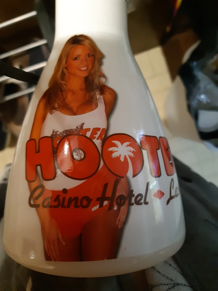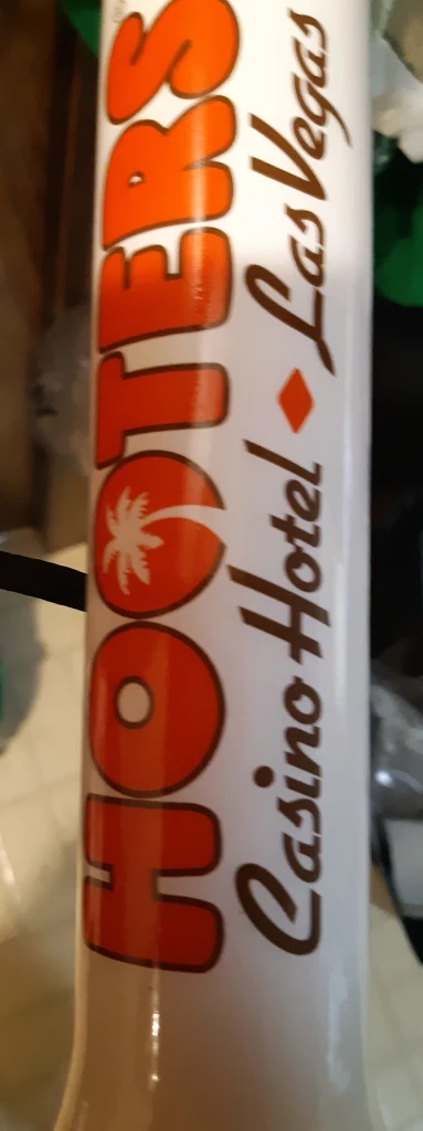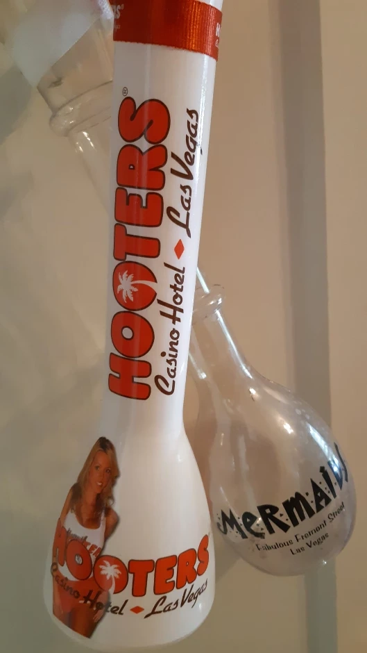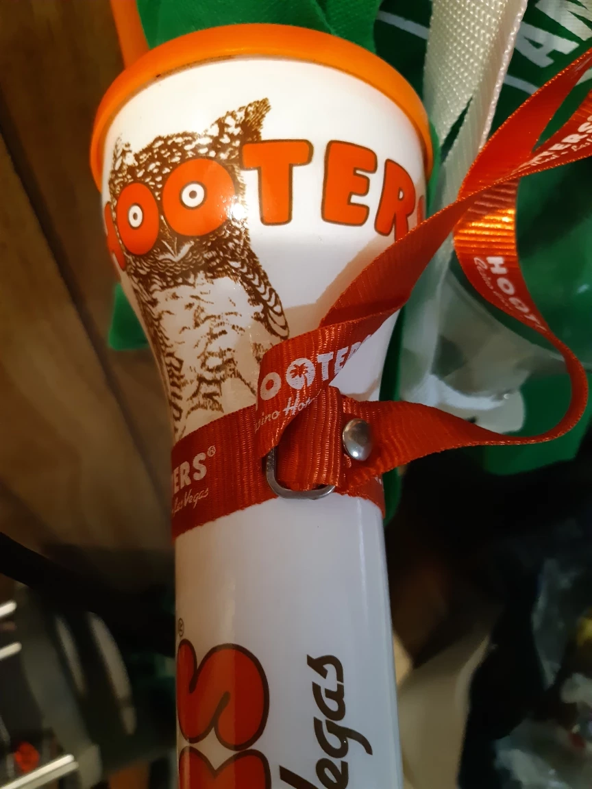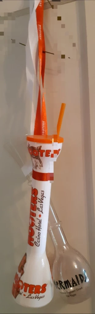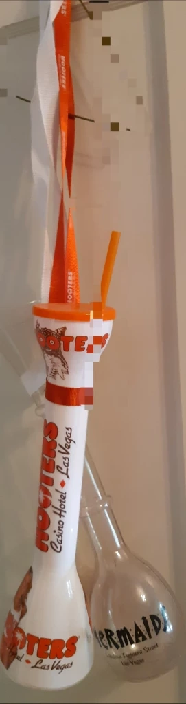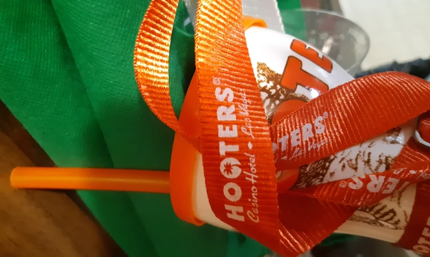 Collectible Hooters Casino Hotel Las Vegas drink cup. Features orange and white design. Includes a straw and ribbon. Perfect for memorabilia collectors. Vintage drinking containers.