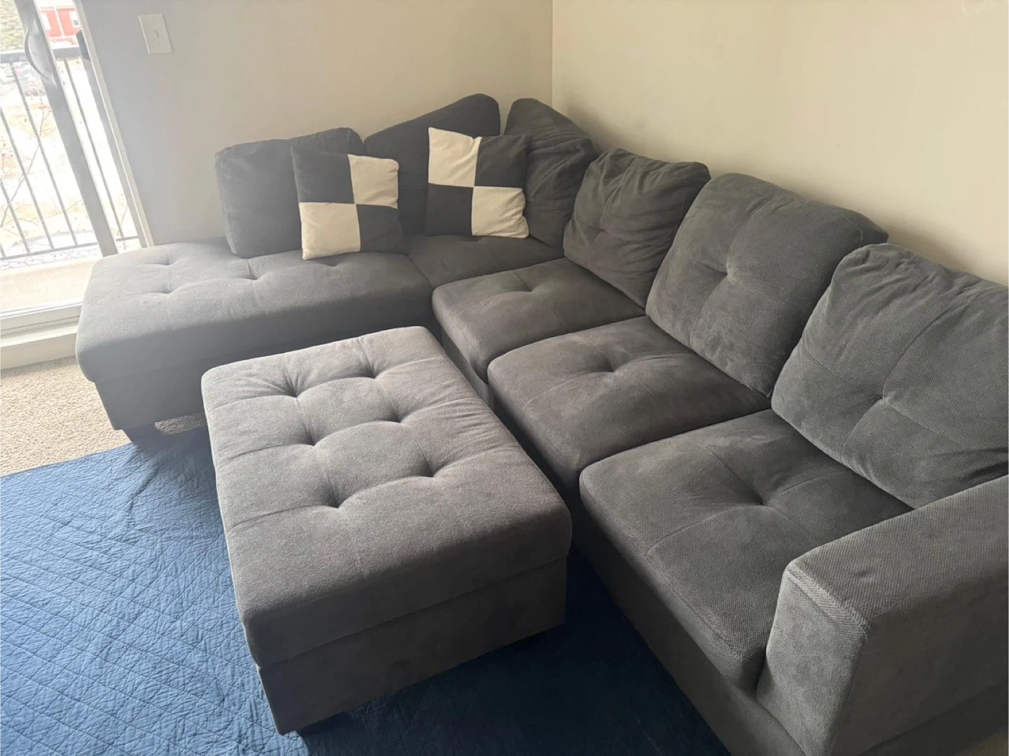 This is a grey sectional sofa with a matching ottoman. It features tufted cushions for comfort and style. The ottoman offers extra seating or storage space.
