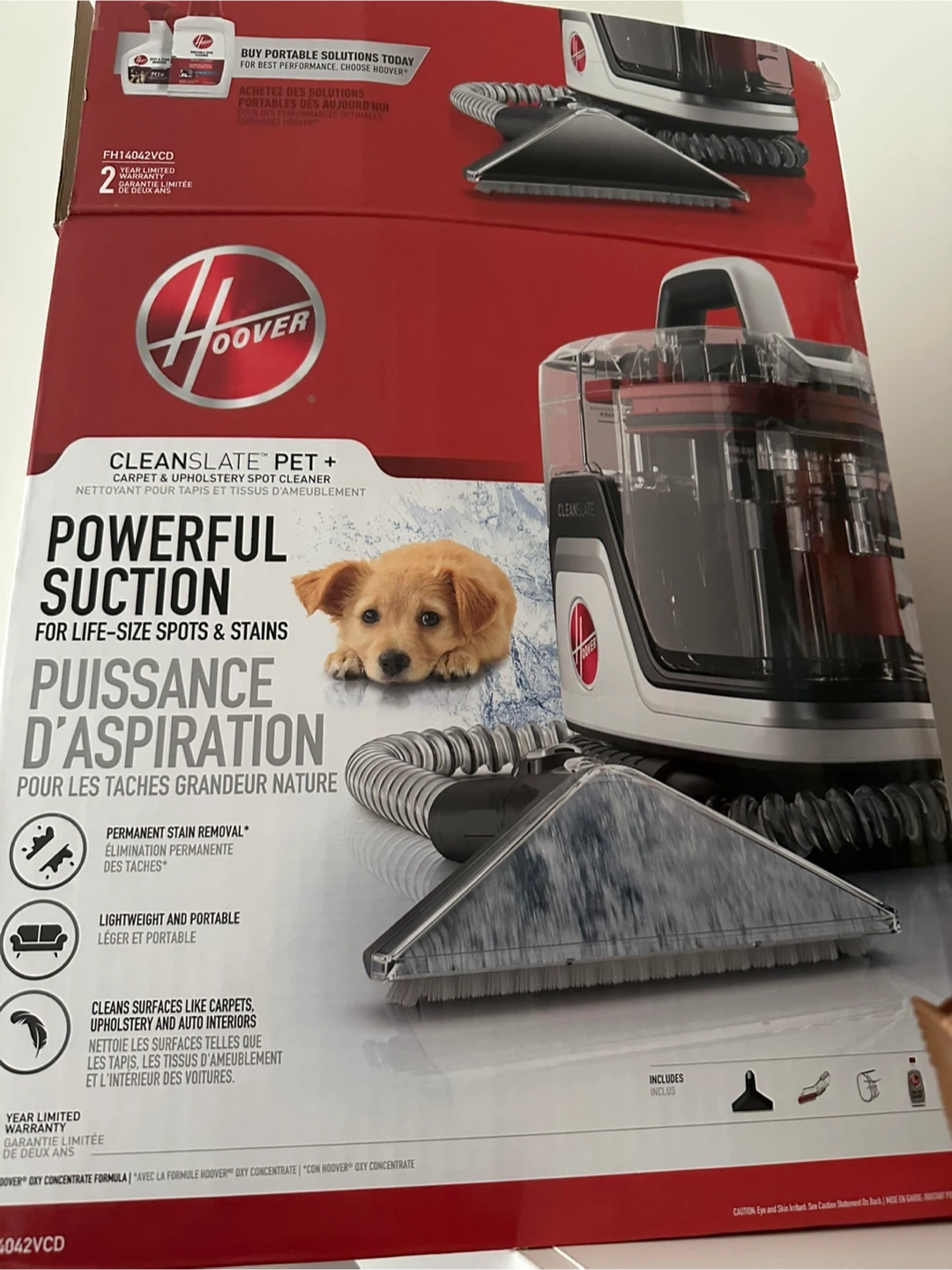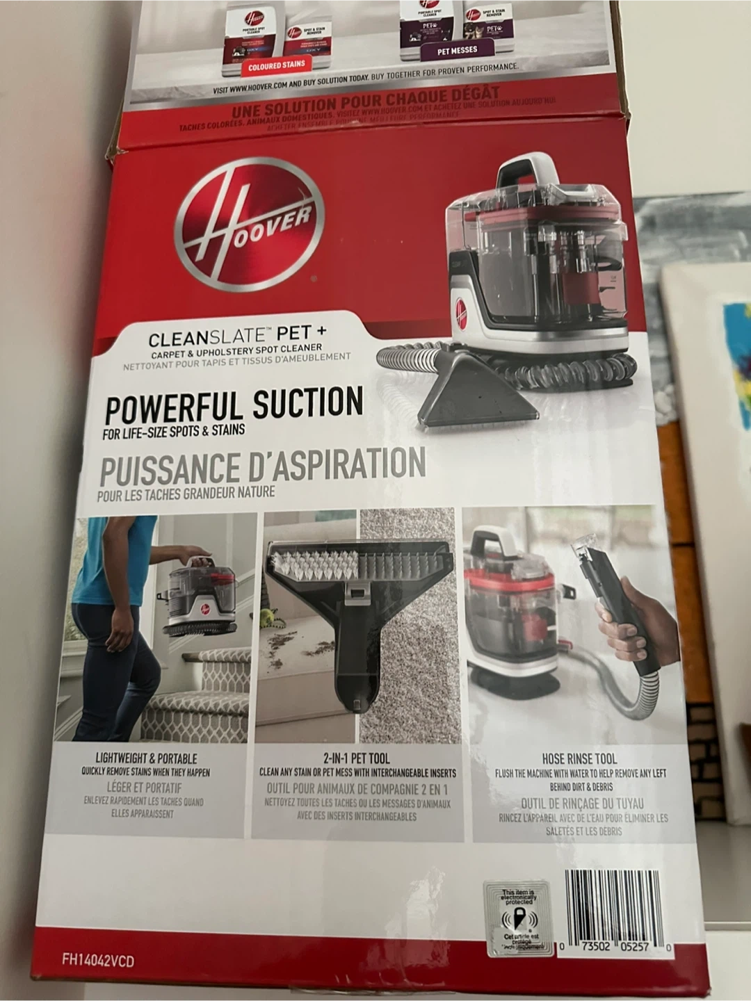 10I'm selling a Hoover CleanSlate Pet+ carpet and upholstery spot cleaner! It's lightweight and portable, and cleans surfaces like carpets, upholstery, and auto interiors. It has powerful suction for life-size spots and stains. The box is included