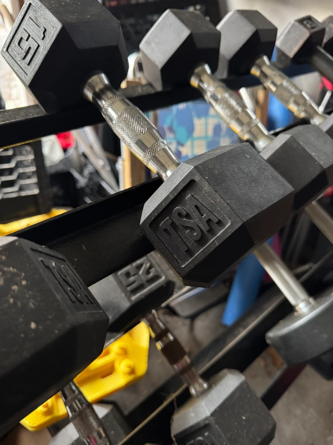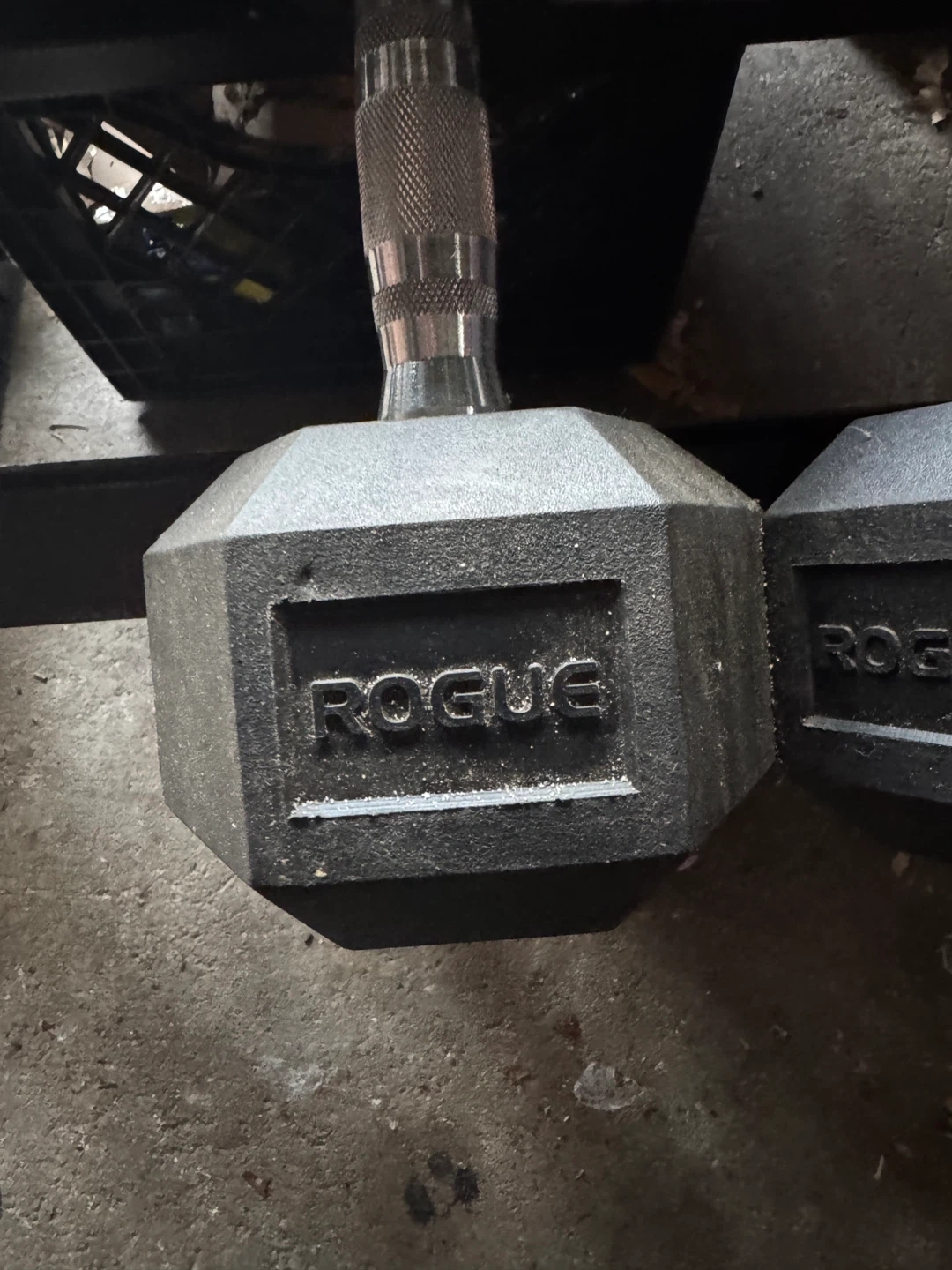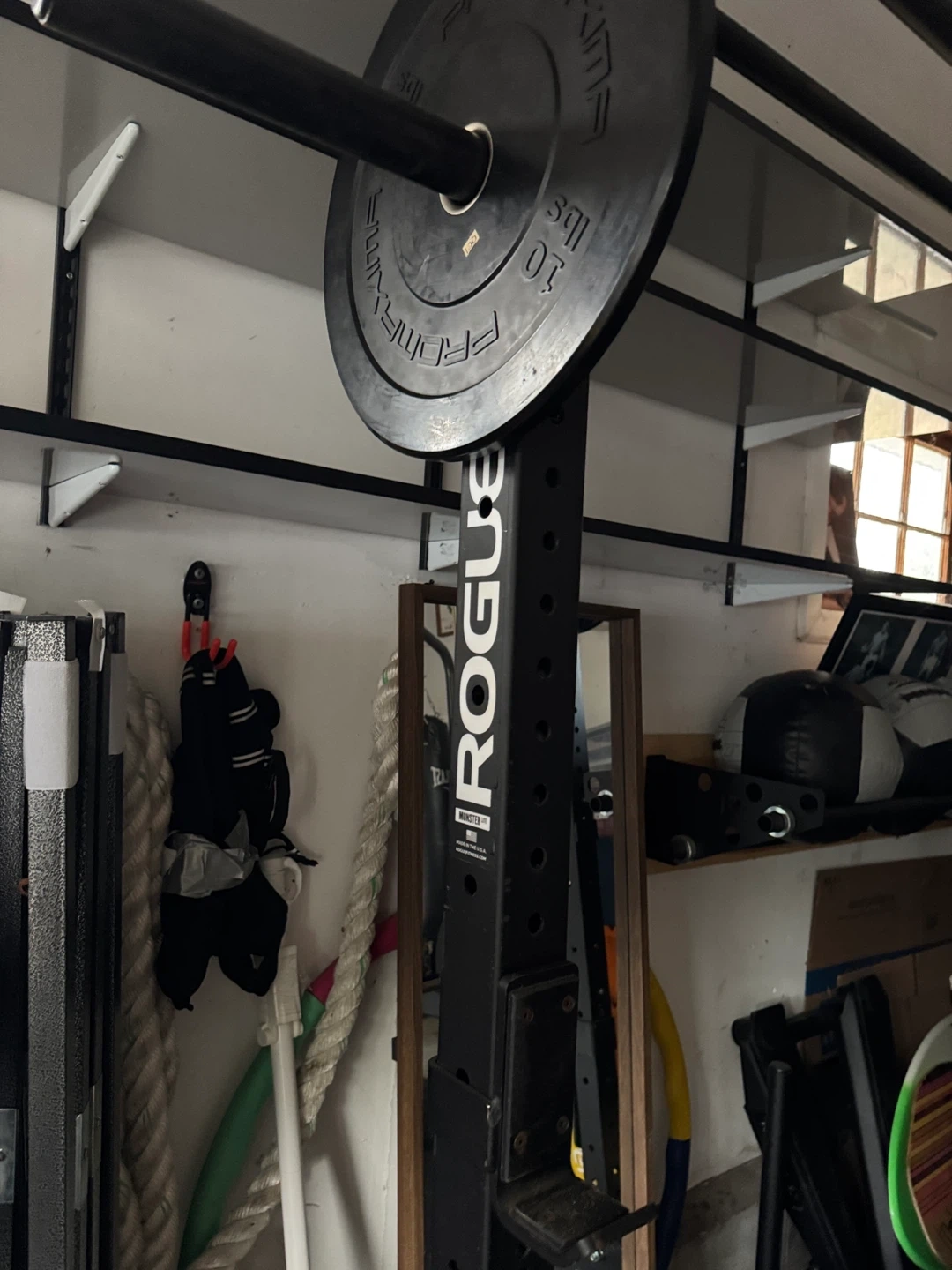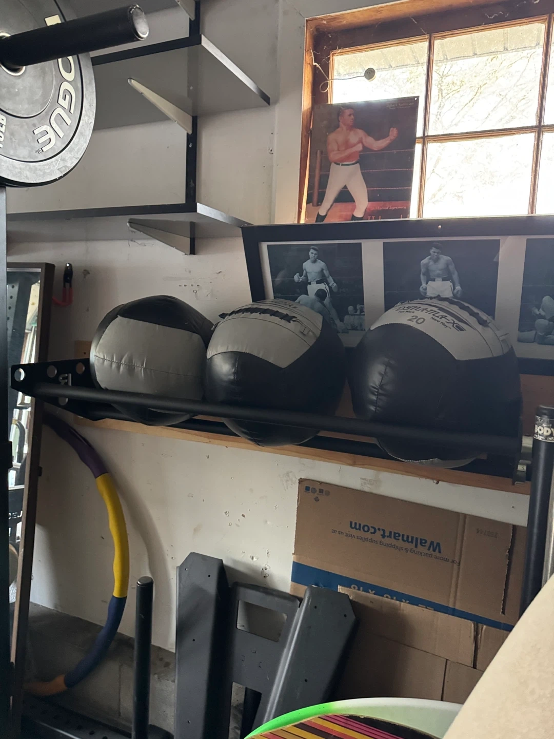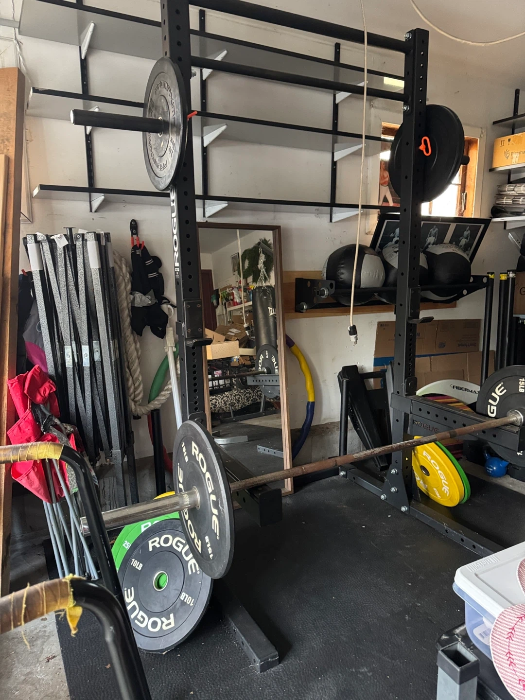 Set of Rogue weight plates, includes one 10lb plate, one 25lb plate, and one yellow plate. Made for weightlifting and training. Great for home gyms! Weighted ball, punching bag and stand !