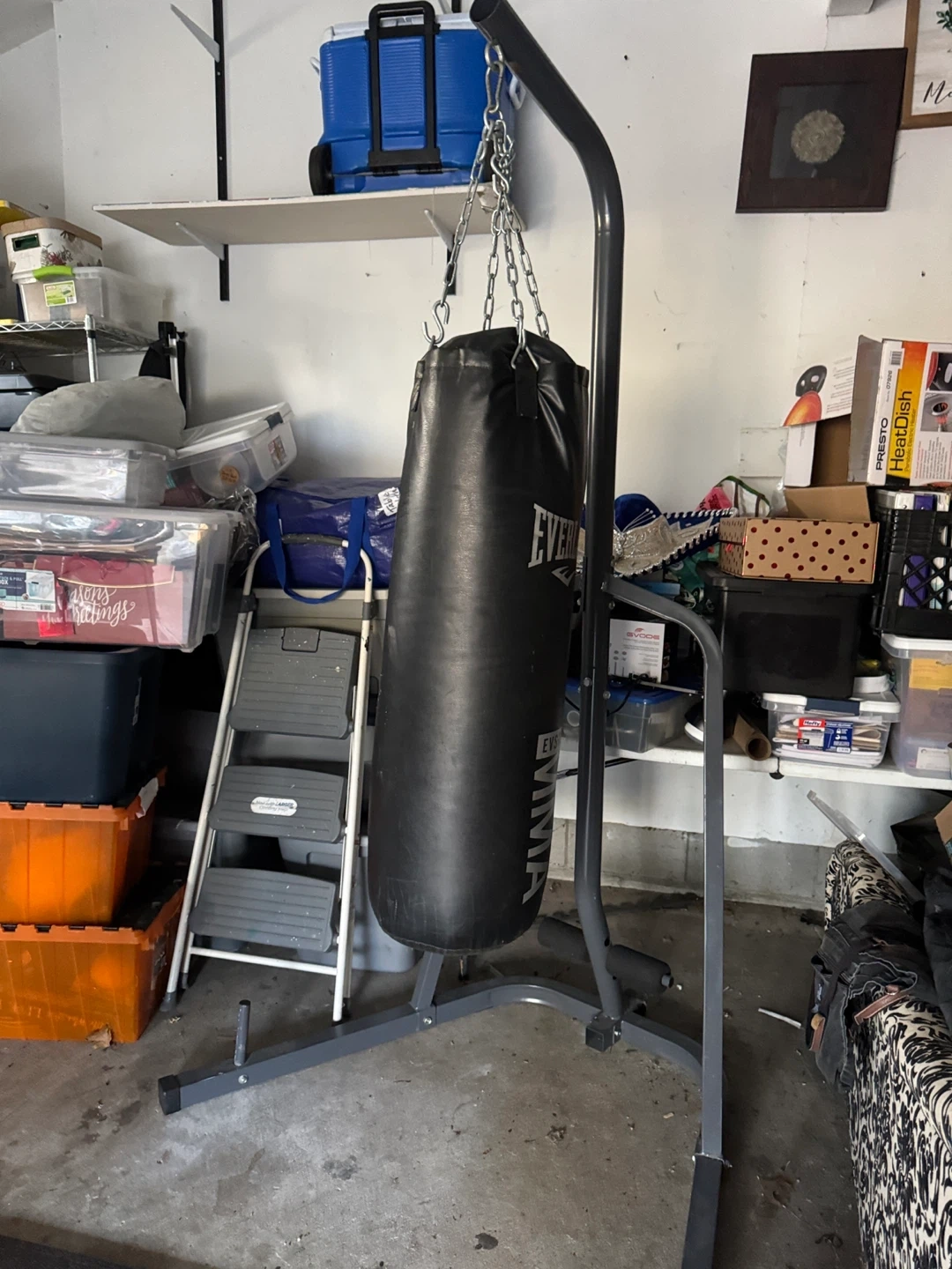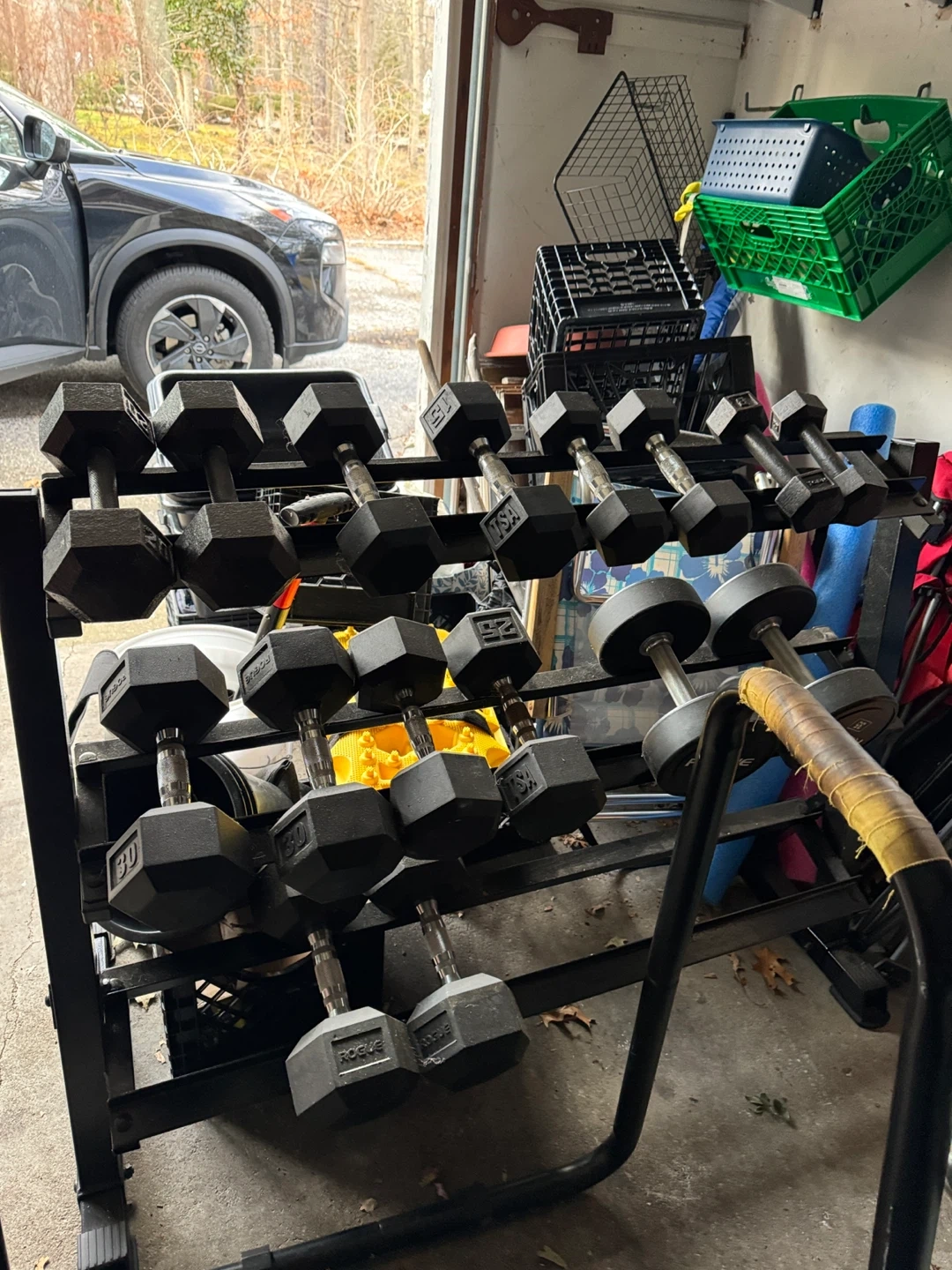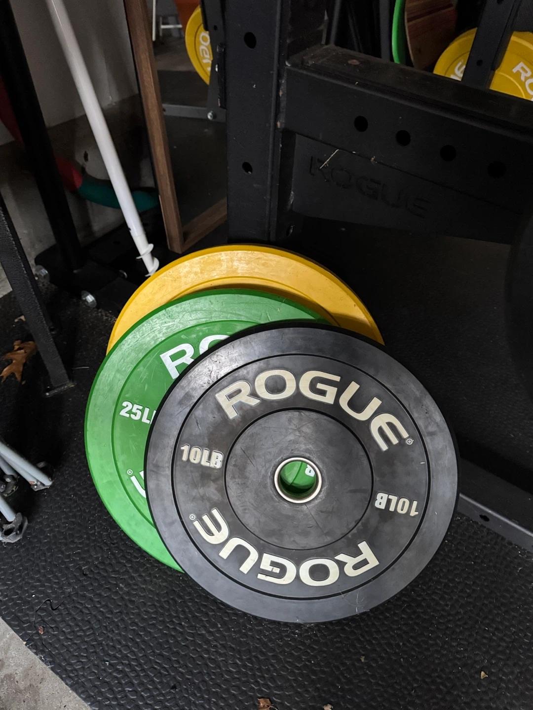 Set of Rogue weight plates, includes one 10lb plate, one 25lb plate, and one yellow plate. Made for weightlifting and training. Great for home gyms! Weighted ball, punching bag and stand !