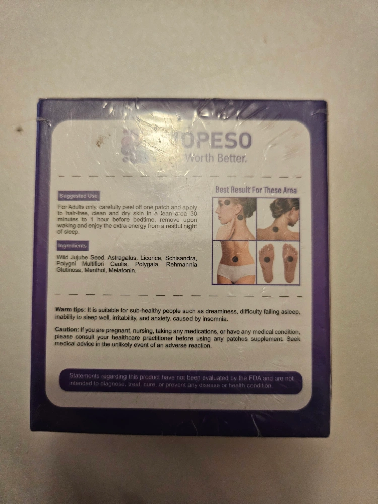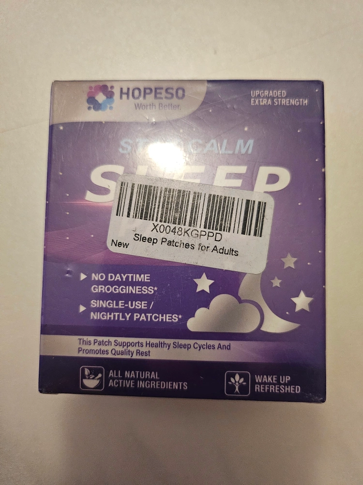 New, upgraded extra strength sleep patches. Single-use patches promote healthy sleep cycles and quality rest. All natural active ingredients. Intended to help with sleeplessness, daytime grogginess. Contains Wild Jujube Seed, Astragalus, Licorice, Schisandra, Polygala, Rehmannia, Glutathione, Melatonin. Brand new, not opened.