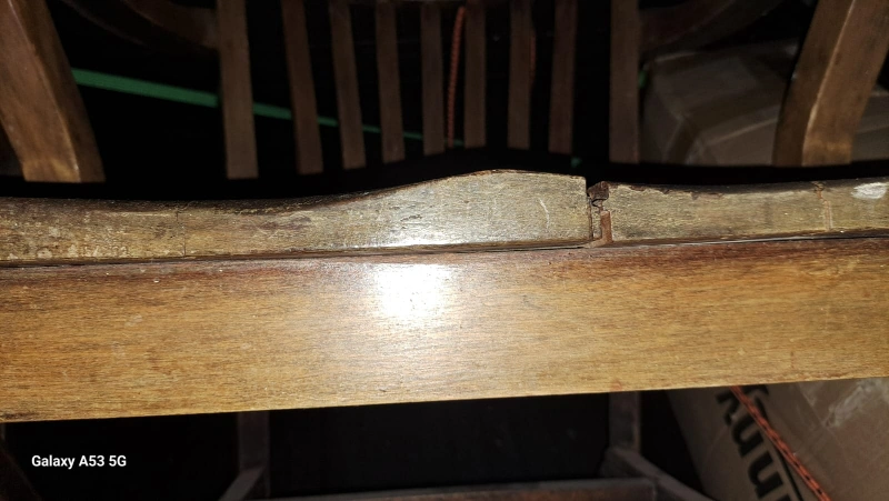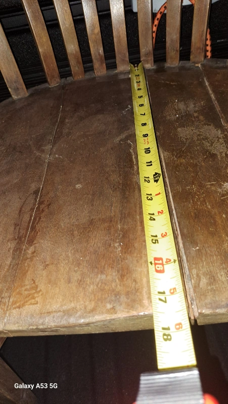Handmade, dove-tailed in a plank style seat. Solid wood, oak, heavy duty with a dark finish and armrests. Great for indoors or outdoor at cottage, suitable for all weather.