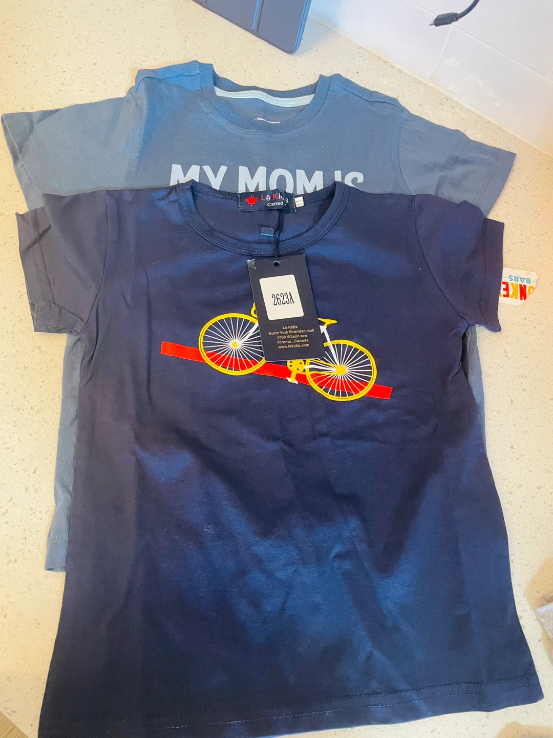 Two kids' t-shirts from Lé Kids. The navy shirt has a bicycle graphic and comes with a tag. The blue shirt has "MY MOM IS" text. Both are short-sleeved.