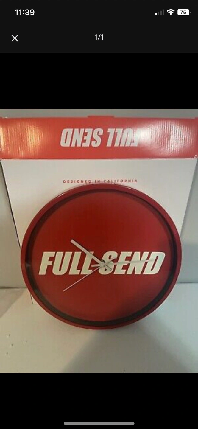 Selling a red wall clock with 'FULL SEND' printed on the face. It's designed in California and comes with its original box!