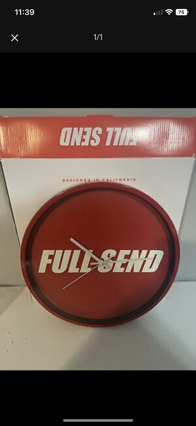 Selling a red wall clock with 'FULL SEND' printed on the face. It's designed in California and comes with its original box!