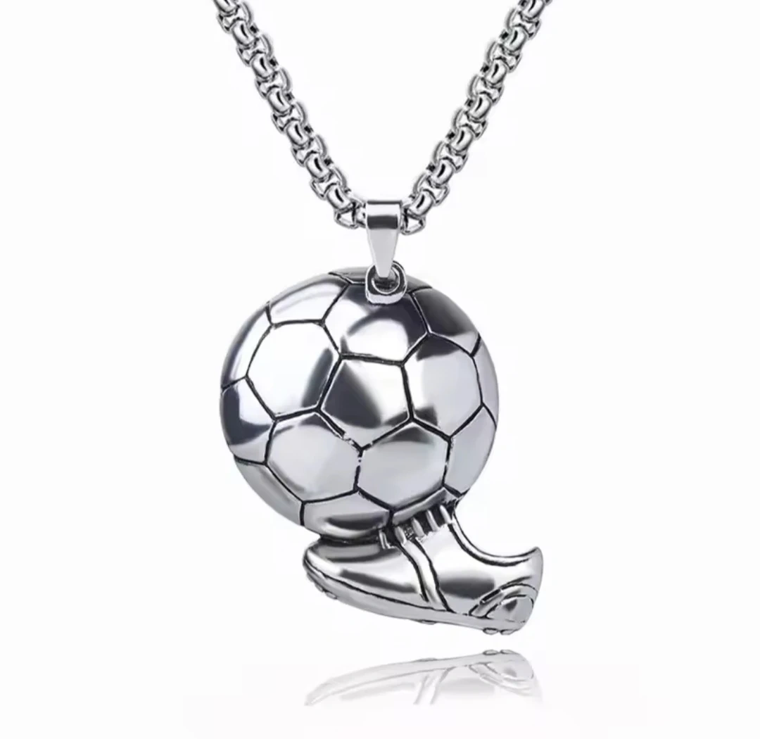 This necklace features a detailed soccer ball pendant with a tiny cleat. It's made of silver-toned metal. This accessory is great for any soccer enthusiast!