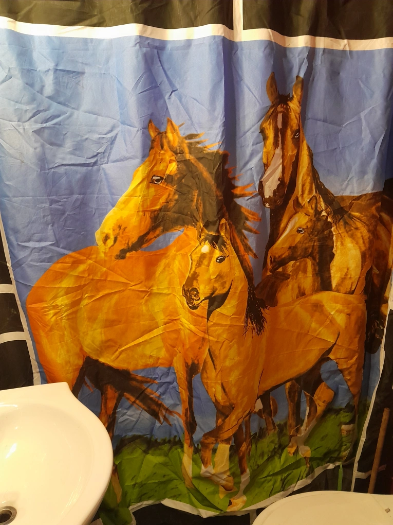 Here's a shower curtain with a horse print. It features several brown horses against a blue and green background. It's in great condition and ready to add a bit of equestrian flair to your bathroom