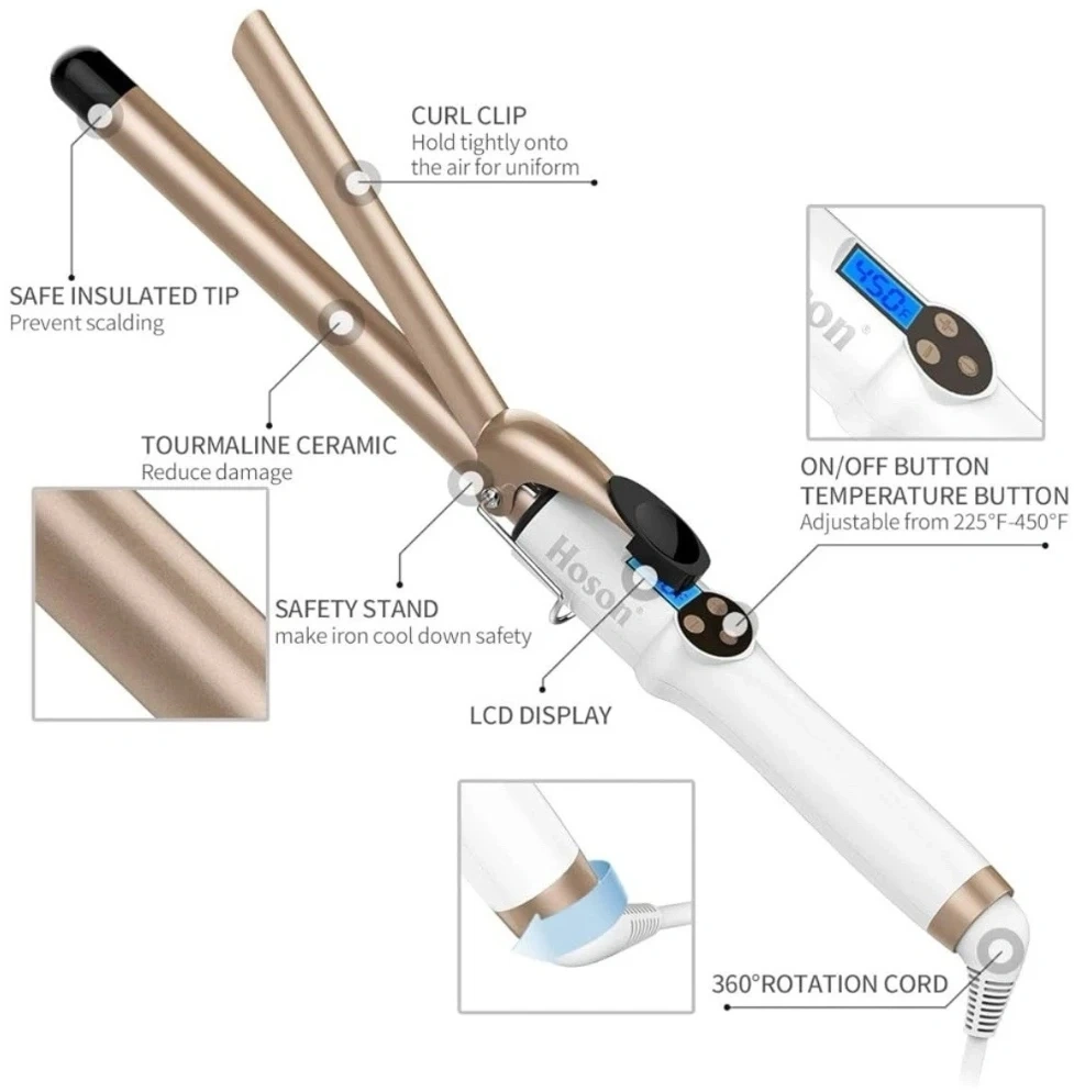 22Selling a HOSON professional hair curler new condition! It features tourmaline ceramic technology to help reduce frizz and lock in moisture. The curler has a safe insulated tip to prevent scalding and a safety stand for cooling down. It also has an LCD display and adjustable temperature settings from 225°F to 450°F. The 360° rotation cord makes it easy to use. Comes with the original box!