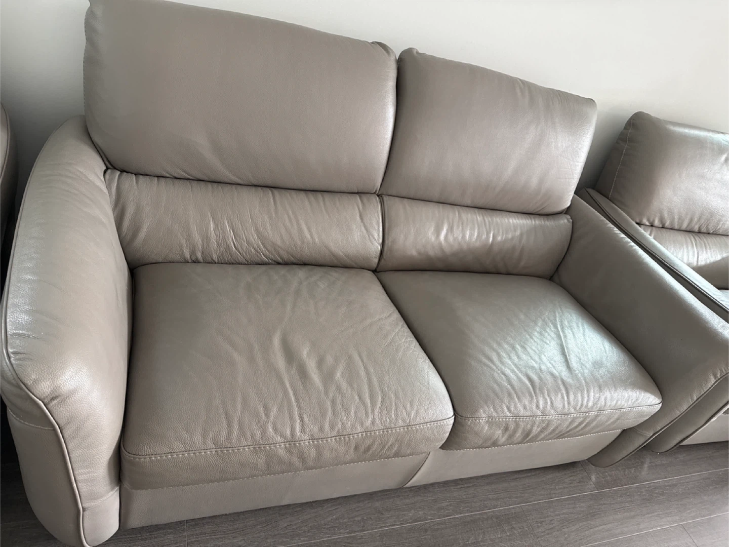 Selling a leather sofa and armchair set. They are a light grey colour and would be great for a living room or den. There are some signs of wear on the armchair seat.