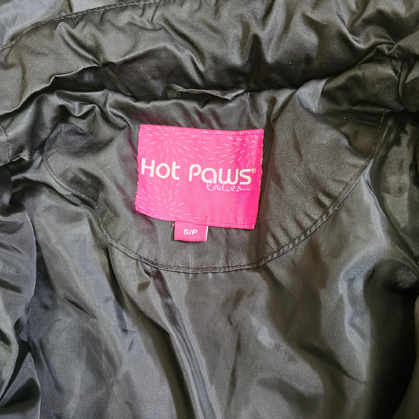 10Hot Paws ladies black winter coat, perfect for staying warm this winter! It's a size small (S/P). The coat features a hood with faux fur trim and a zippered front. Great for those cold Canadian days!