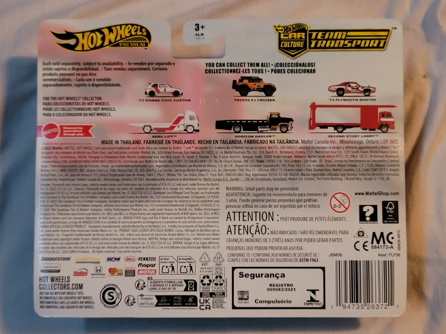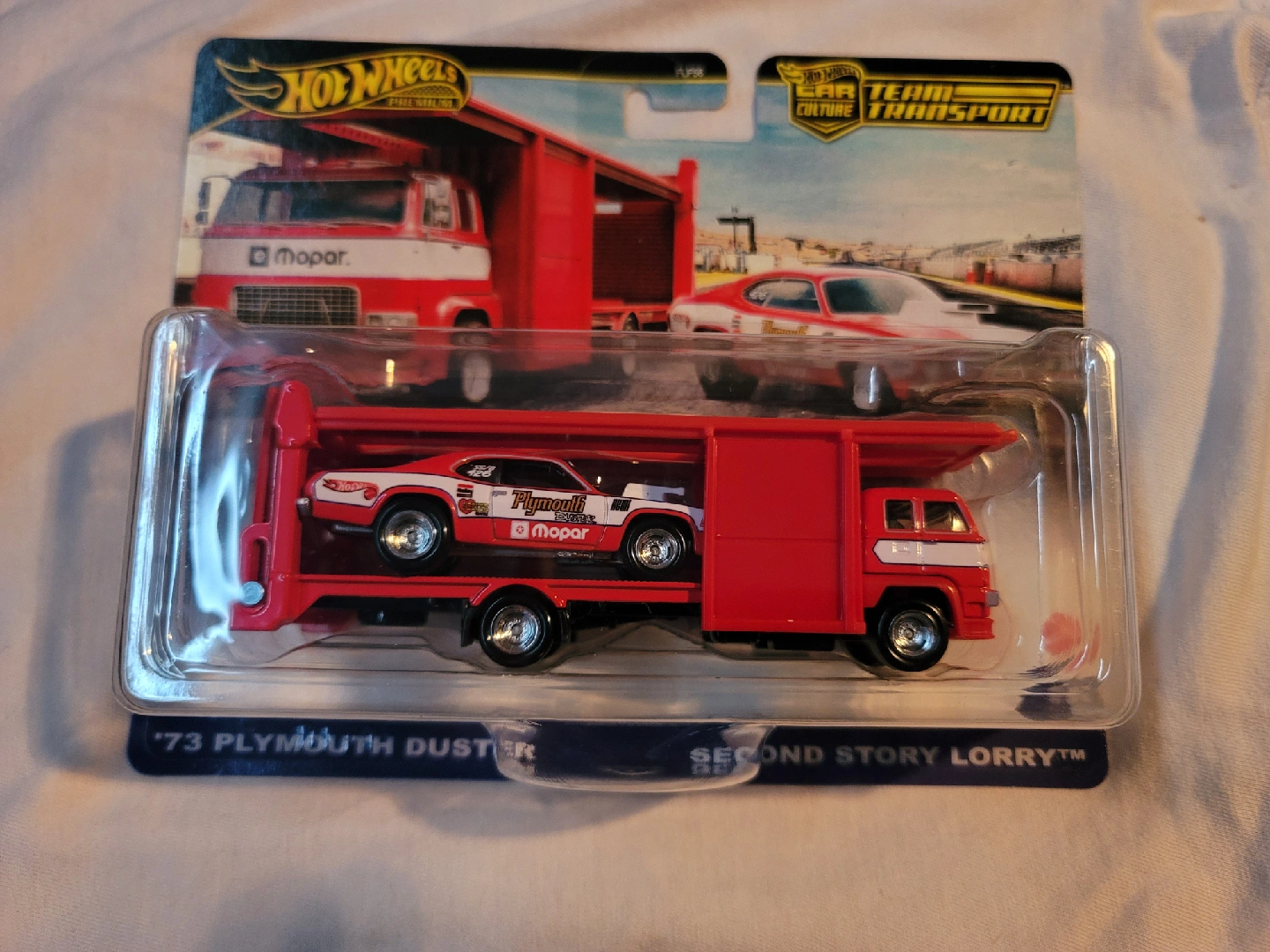 Hot Wheels Car Culture Team Transport featuring the '73 Plymouth Duster and Second Story Lorry! It's brand new and still in its original packaging, perfect for collectors or anyone who loves cool car sets