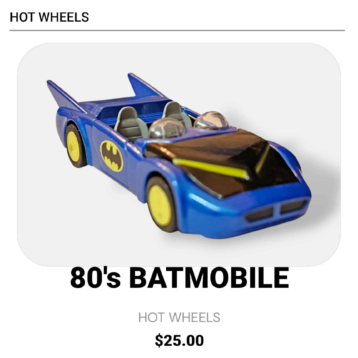 🚗 Hot Wheels 1:64 Scale 1980s style Batmobile – Classic Collectible! 🚗 Cruise into your collection with this 1980s Batmobile from Hot Wheels! Perfect for fans of the Dark Knight and vintage die-cast vehicles, this 1:64 scale Batmobile captures the sleek design and iconic details of Gotham’s legendary ride. 🪐 Scale: 1:64 🌟 Model: 1980s style Batmobile (date: current) ✨ Condition: Excellent vintage-style collectible – display-ready 💰 Price: $25 📍 Pickup: Ottawa – Blackburn Hamlet (Tim Hortons meetup) Add this classic Batmobile to your collection and bring Gotham’s hero home! 🦇 Selling a Hot Wheels 80's Batmobile! It's in great shape and ready for a new home. Originally priced at $25.00