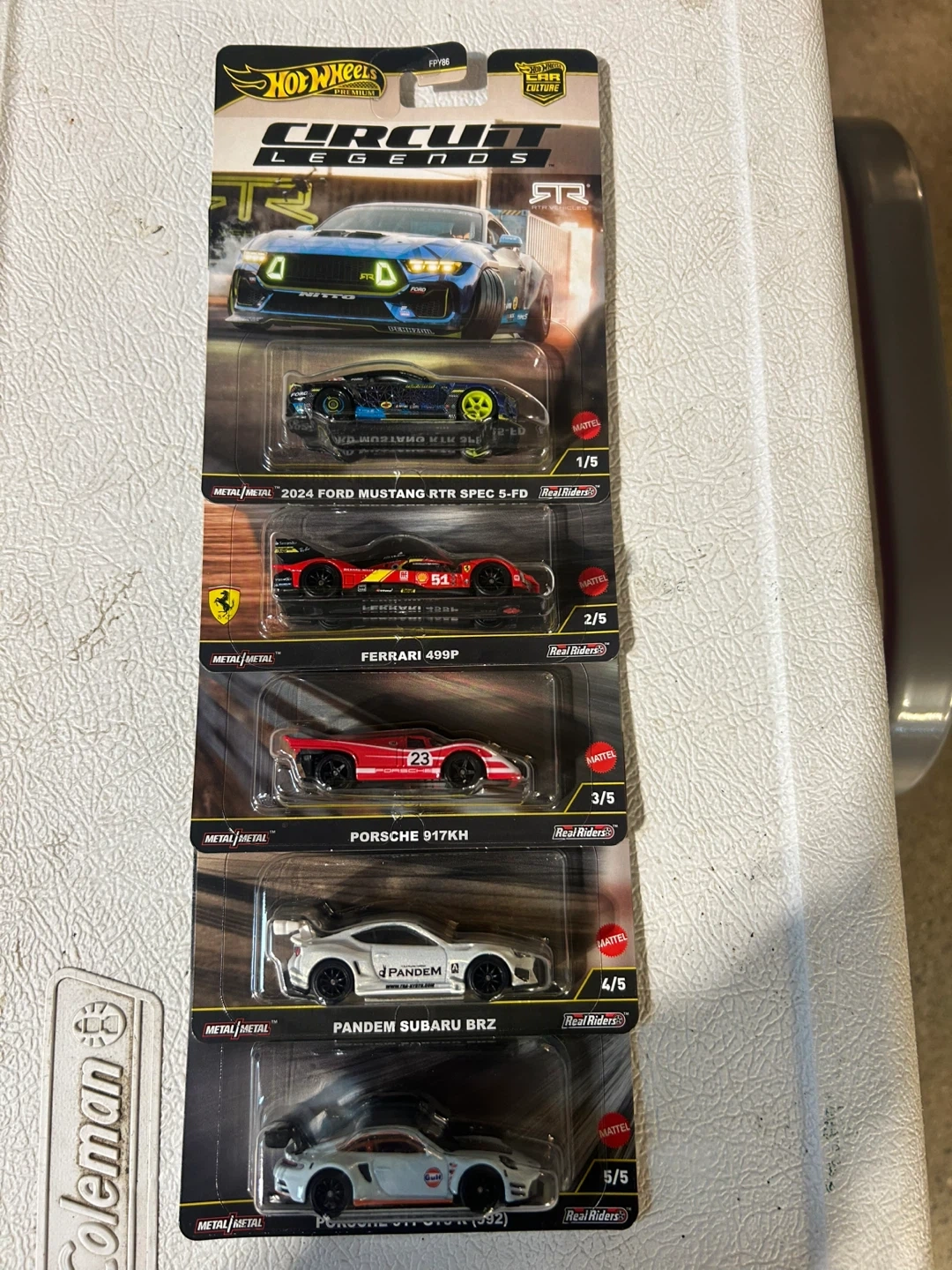 10Selling a complete set of Hot Wheels Circuit Legends! This set includes: - 2024 Ford Mustang RTR Spec 5-FD - Ferrari 499P - Porsche 917KH - Pandem Subaru BRZ - Porsche 911 GT3 (992) All cars are metal/metal with Real Riders tires and come in their original packaging