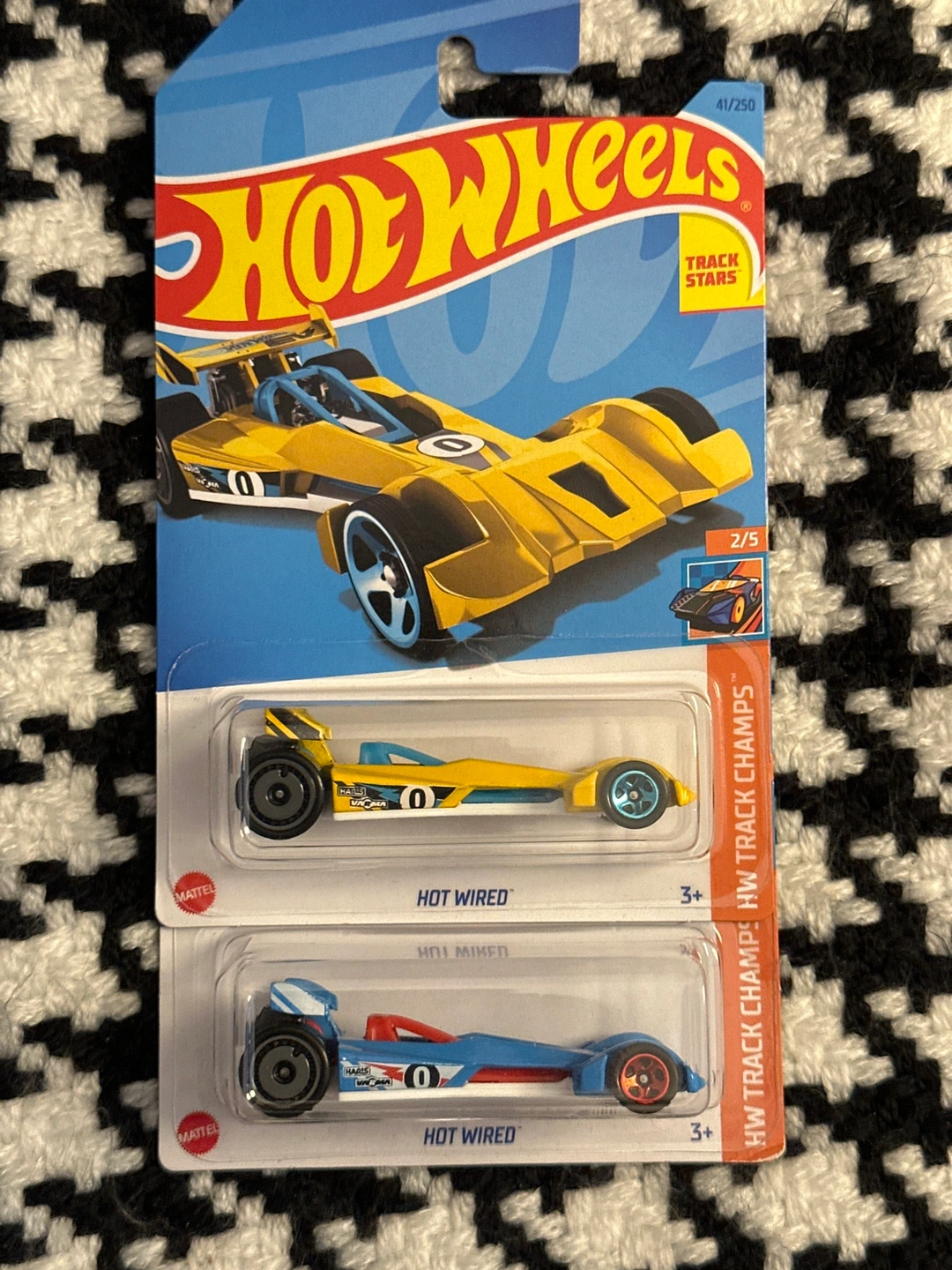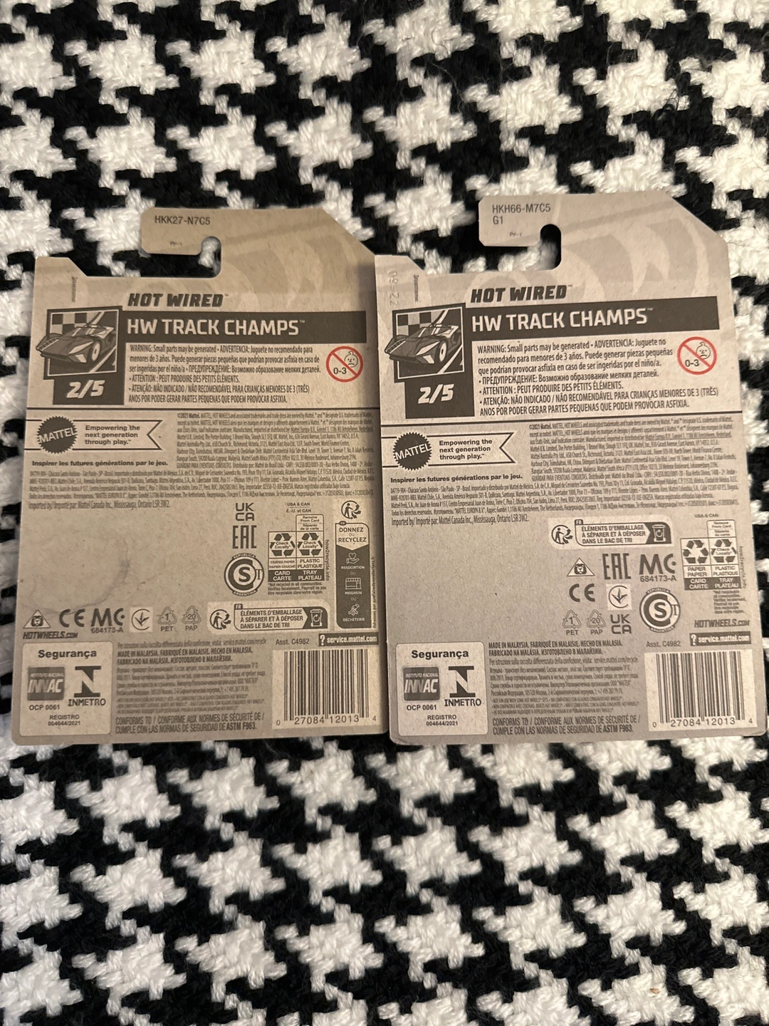 Hot Wheels Track Champs cars. One is yellow with blue details, and one is blue with orange details.